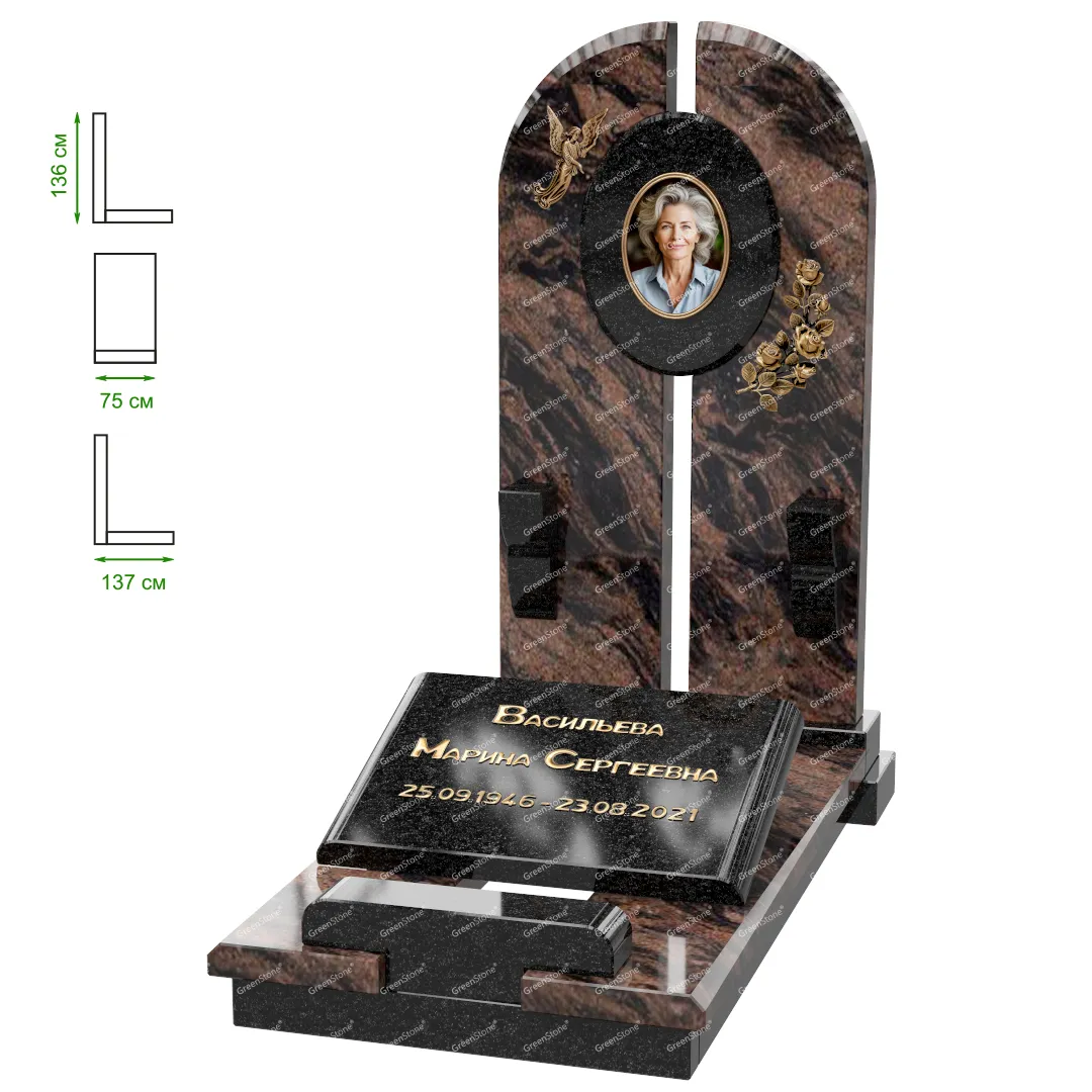 Визуально комплекс отличается от типовой формы не только формой, но и размерами. Массивная стела позволяет дизайнеру реализовать практически любые задумки и пожелания Заказчика, придать готовому изделию солидный вид, раскрыть все достоинства использованного в его изготовлении гранита. Такой габаритный памятник требует профессиональной доставки и установки. Все это также можно заказать в мастерской Грин-Стоун.