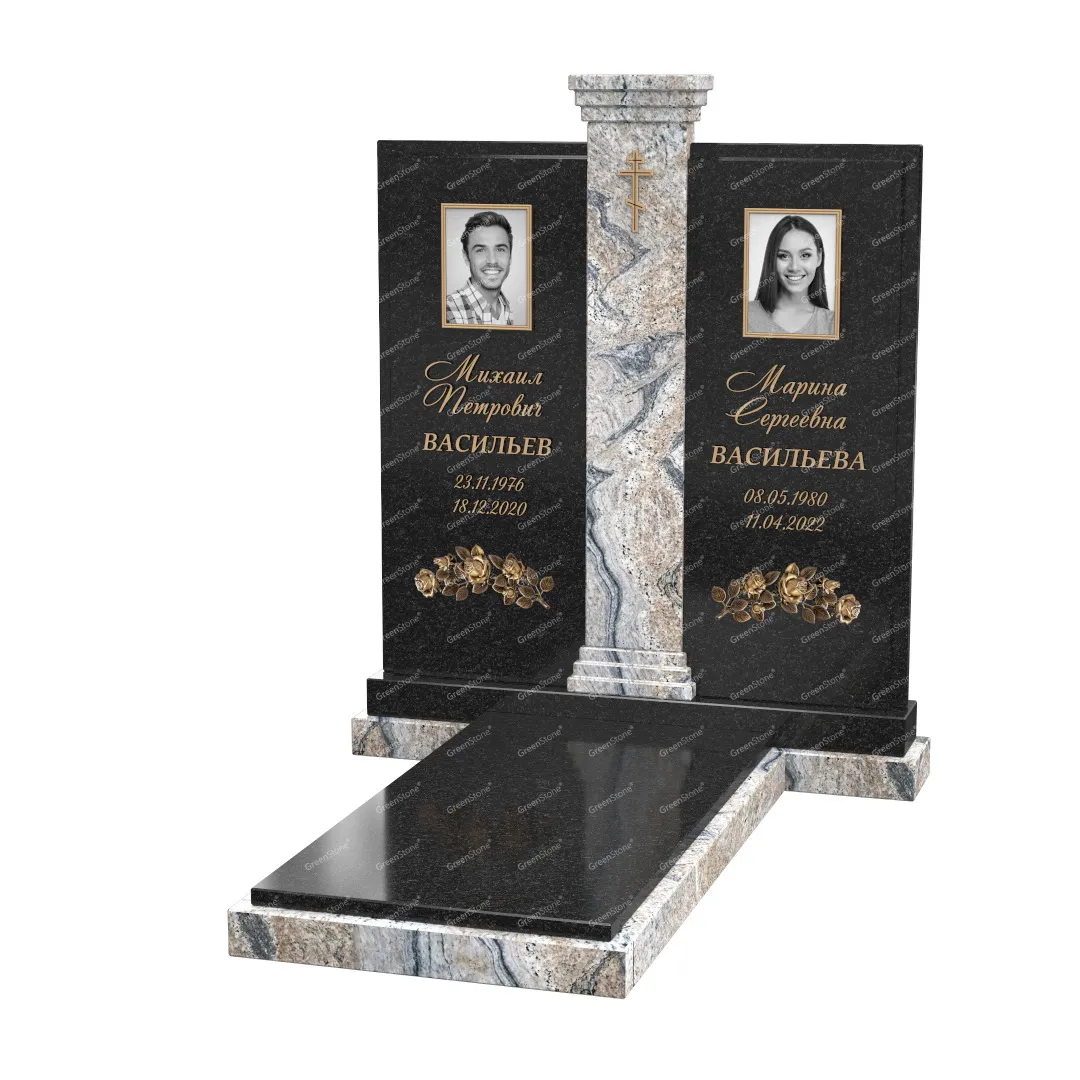 Визуально комплекс отличается от типовой формы не только формой, но и размерами. Массивная стела позволяет дизайнеру реализовать практически любые задумки и пожелания Заказчика, придать готовому изделию солидный вид, раскрыть все достоинства использованного в его изготовлении гранита. Такой габаритный памятник требует профессиональной доставки и установки. Все это также можно заказать в мастерской Грин-Стоун.