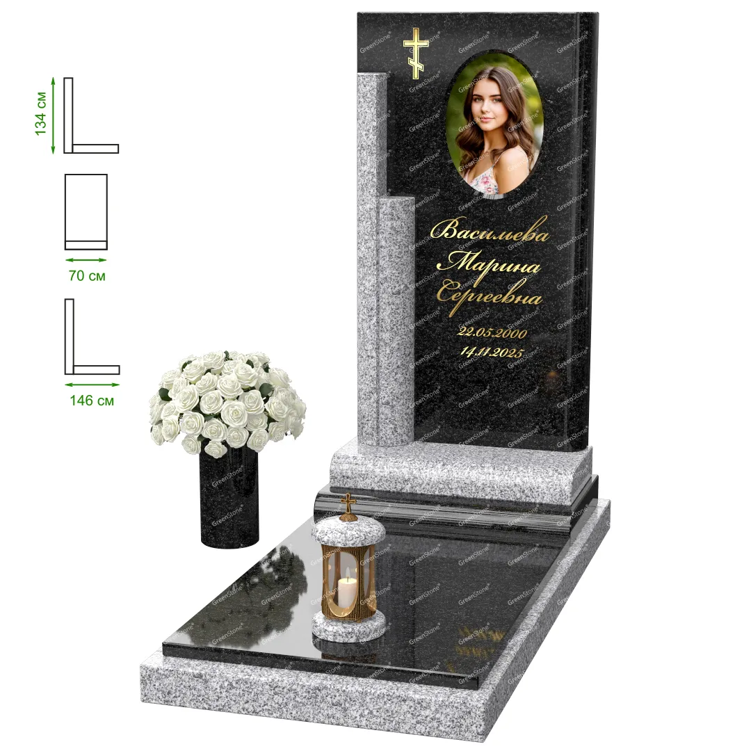 Визуально комплекс отличается от типовой формы не только формой, но и размерами. Массивная стела позволяет дизайнеру реализовать практически любые задумки и пожелания Заказчика, придать готовому изделию солидный вид, раскрыть все достоинства использованного в его изготовлении гранита. Такой габаритный памятник требует профессиональной доставки и установки. Все это также можно заказать в мастерской Грин-Стоун.