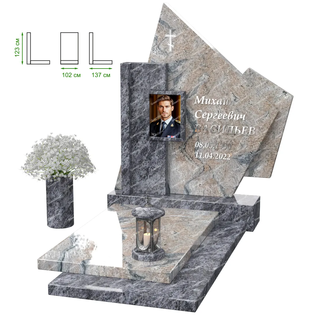Визуально комплекс отличается от типовой формы не только формой, но и размерами. Массивная стела позволяет дизайнеру реализовать практически любые задумки и пожелания Заказчика, придать готовому изделию солидный вид, раскрыть все достоинства использованного в его изготовлении гранита. Такой габаритный памятник требует профессиональной доставки и установки. Все это также можно заказать в мастерской Грин-Стоун.