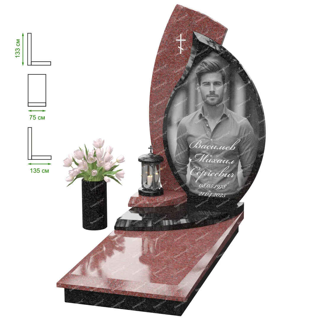 Визуально комплекс отличается от типовой формы не только формой, но и размерами. Массивная стела позволяет дизайнеру реализовать практически любые задумки и пожелания Заказчика, придать готовому изделию солидный вид, раскрыть все достоинства использованного в его изготовлении гранита. Такой габаритный памятник требует профессиональной доставки и установки. Все это также можно заказать в мастерской Грин-Стоун.