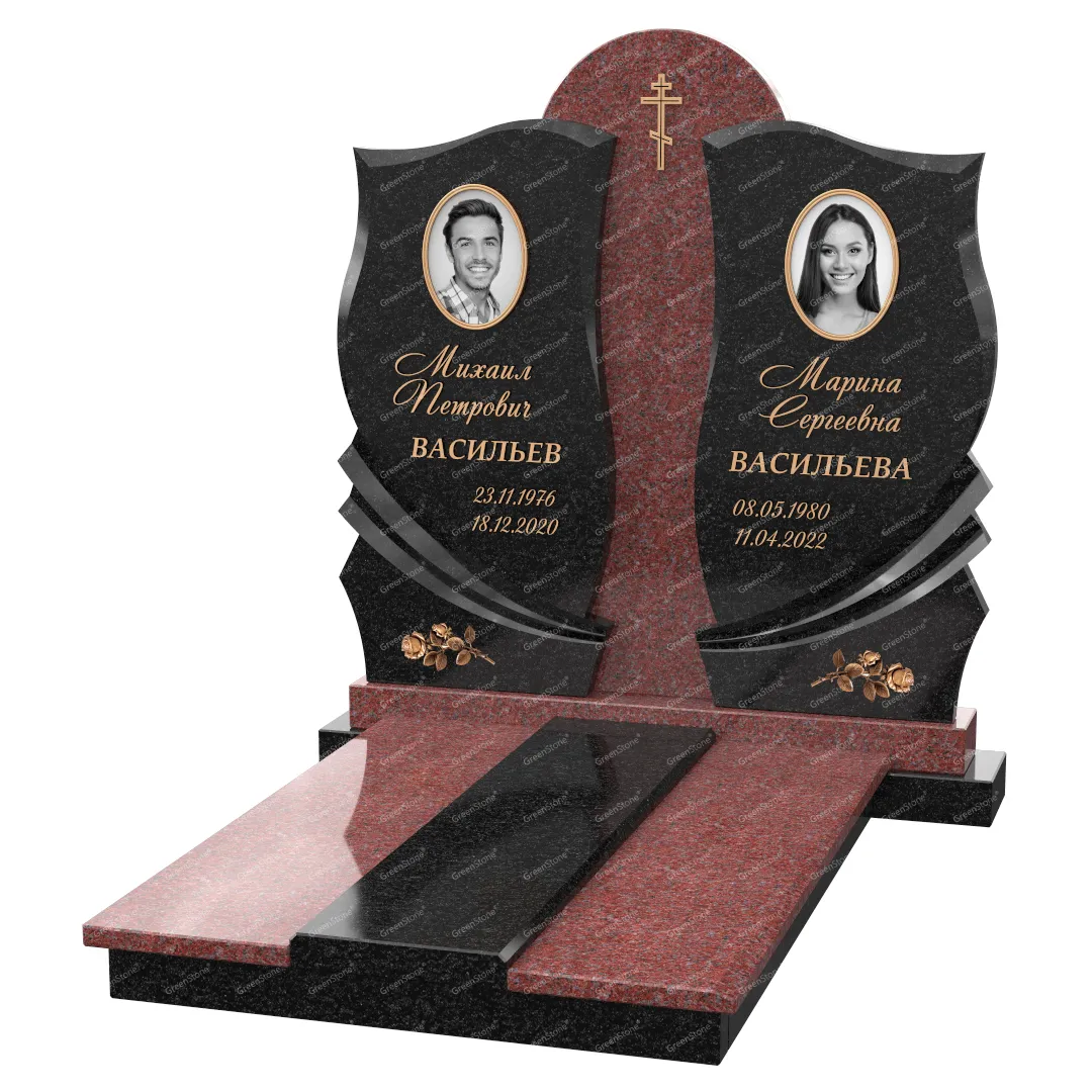 Визуально комплекс отличается от типовой формы не только формой, но и размерами. Массивная стела позволяет дизайнеру реализовать практически любые задумки и пожелания Заказчика, придать готовому изделию солидный вид, раскрыть все достоинства использованного в его изготовлении гранита. Такой габаритный памятник требует профессиональной доставки и установки. Все это также можно заказать в мастерской Грин-Стоун.