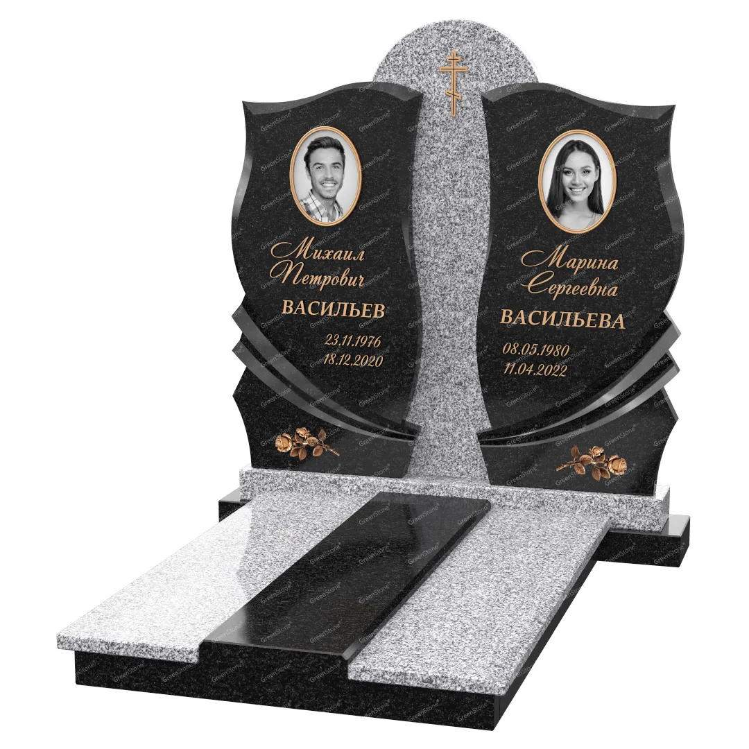 Визуально комплекс отличается от типовой формы не только формой, но и размерами. Массивная стела позволяет дизайнеру реализовать практически любые задумки и пожелания Заказчика, придать готовому изделию солидный вид, раскрыть все достоинства использованного в его изготовлении гранита. Такой габаритный памятник требует профессиональной доставки и установки. Все это также можно заказать в мастерской Грин-Стоун.