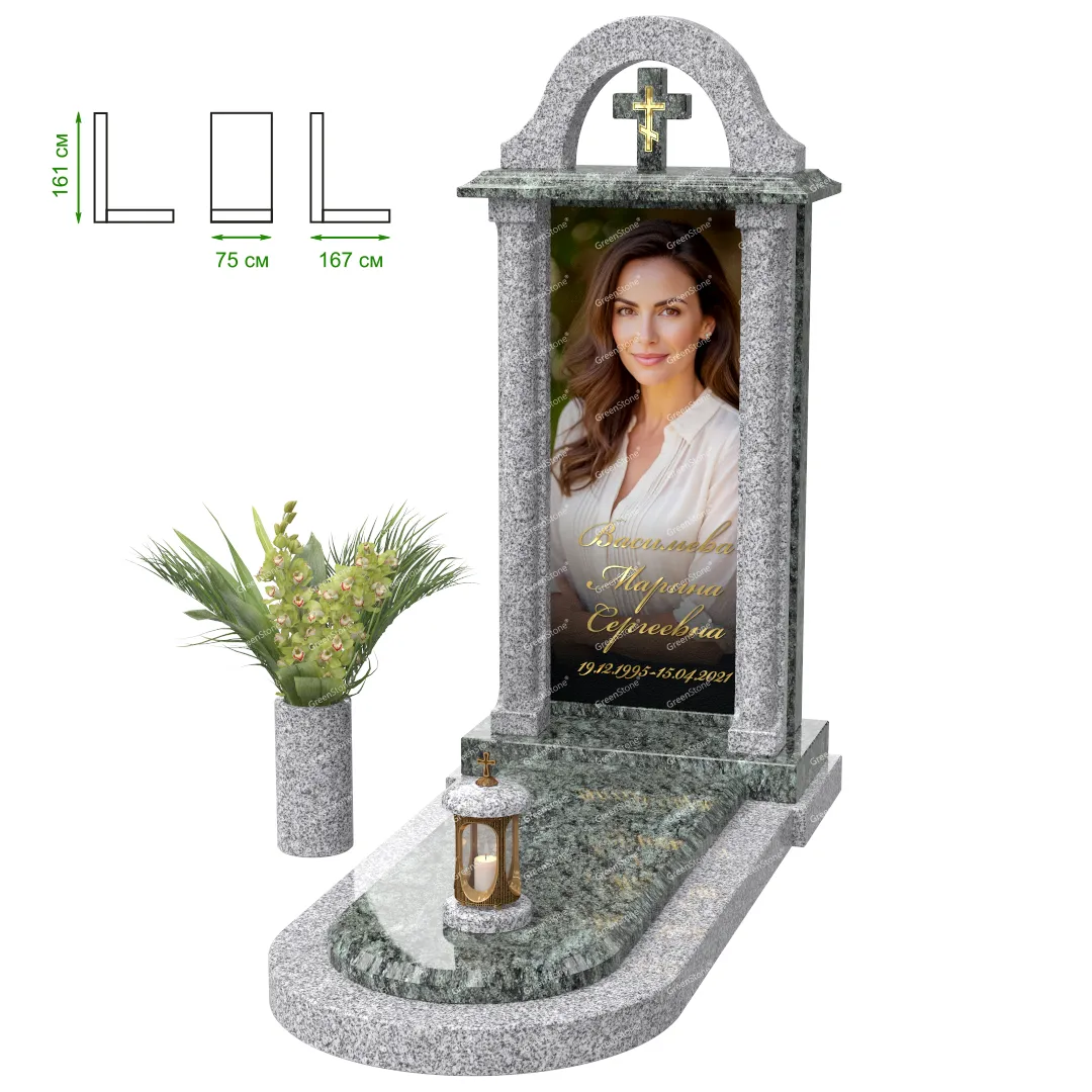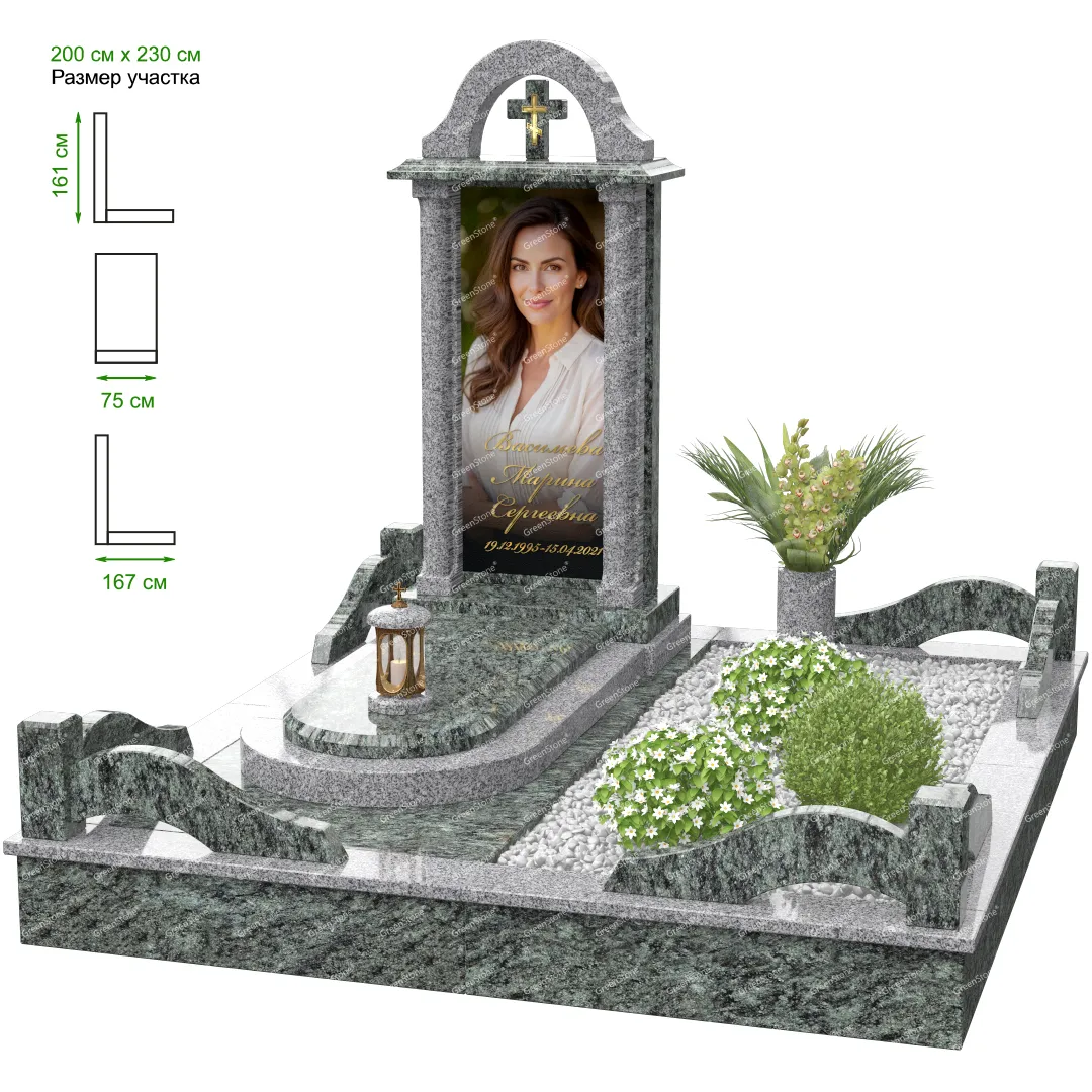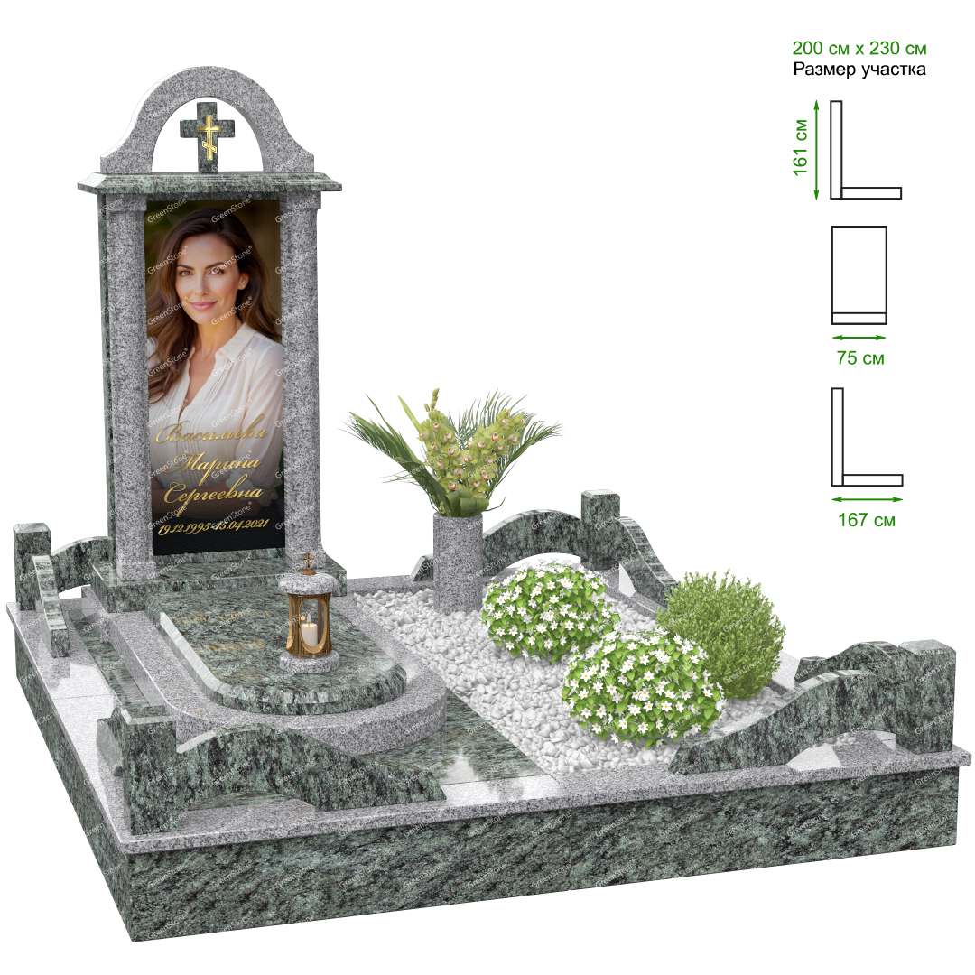Визуально комплекс отличается от типовой формы не только формой, но и размерами. Массивная стела позволяет дизайнеру реализовать практически любые задумки и пожелания Заказчика, придать готовому изделию солидный вид, раскрыть все достоинства использованного в его изготовлении гранита. Такой габаритный памятник требует профессиональной доставки и установки. Все это также можно заказать в мастерской Грин-Стоун.