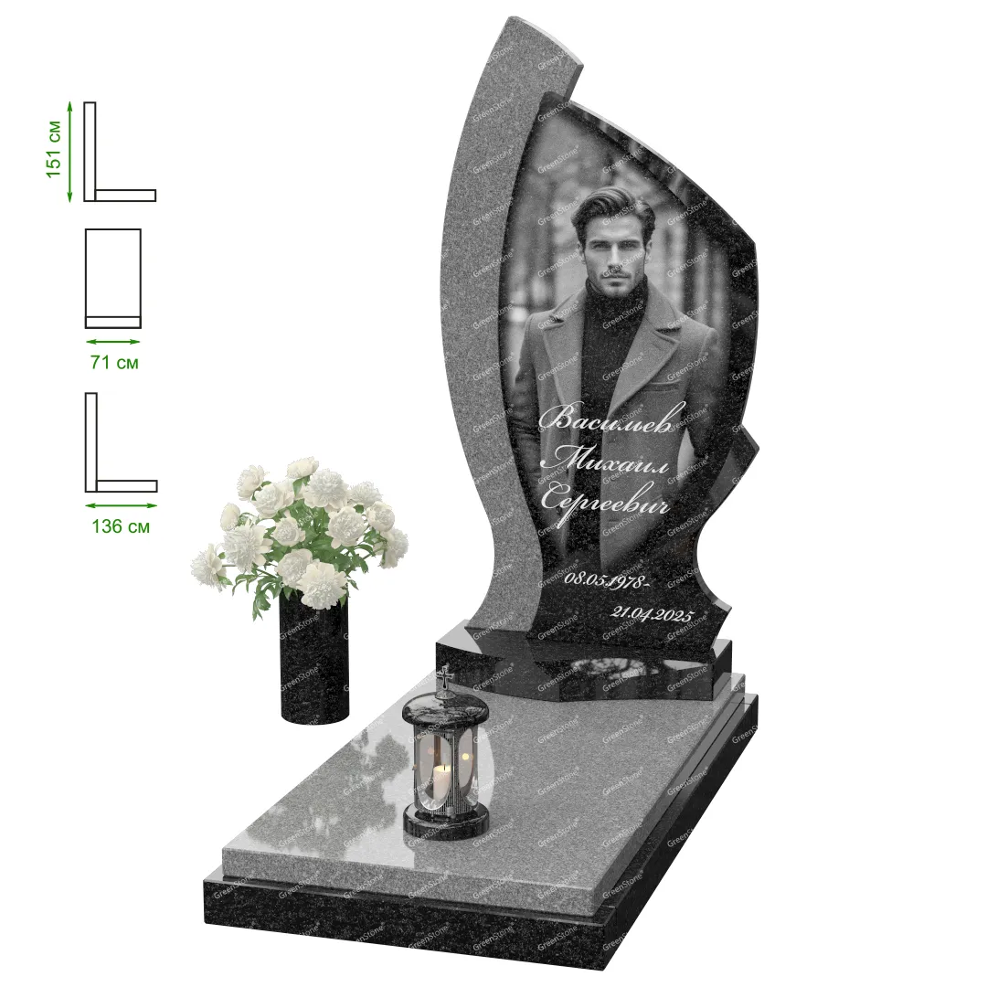Визуально комплекс отличается от типовой формы не только формой, но и размерами. Массивная стела позволяет дизайнеру реализовать практически любые задумки и пожелания Заказчика, придать готовому изделию солидный вид, раскрыть все достоинства использованного в его изготовлении гранита. Такой габаритный памятник требует профессиональной доставки и установки. Все это также можно заказать в мастерской Грин-Стоун.