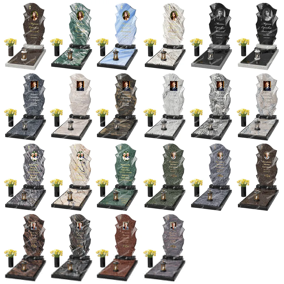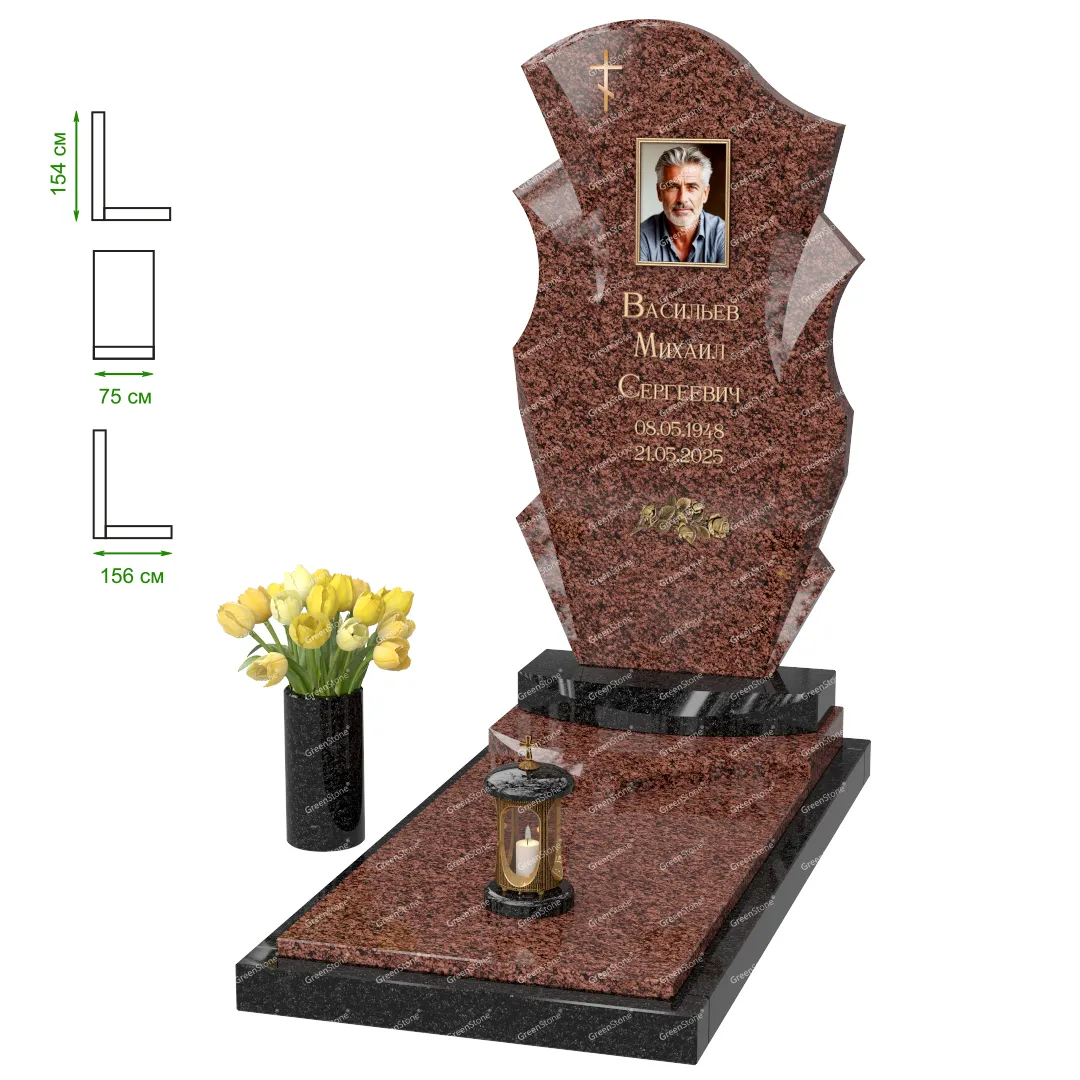 Визуально комплекс отличается от типовой формы не только формой, но и размерами. Массивная стела позволяет дизайнеру реализовать практически любые задумки и пожелания Заказчика, придать готовому изделию солидный вид, раскрыть все достоинства использованного в его изготовлении гранита. Такой габаритный памятник требует профессиональной доставки и установки. Все это также можно заказать в мастерской Грин-Стоун.