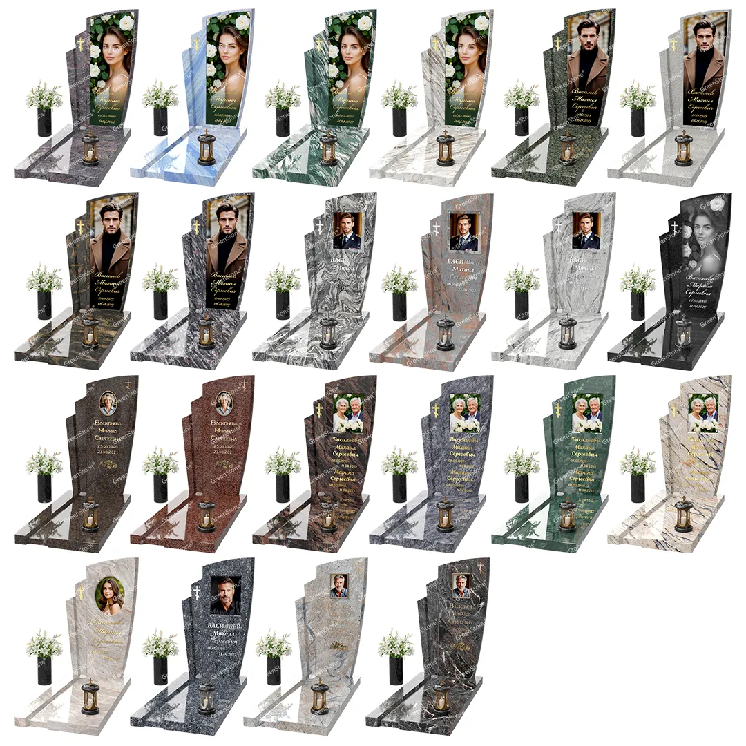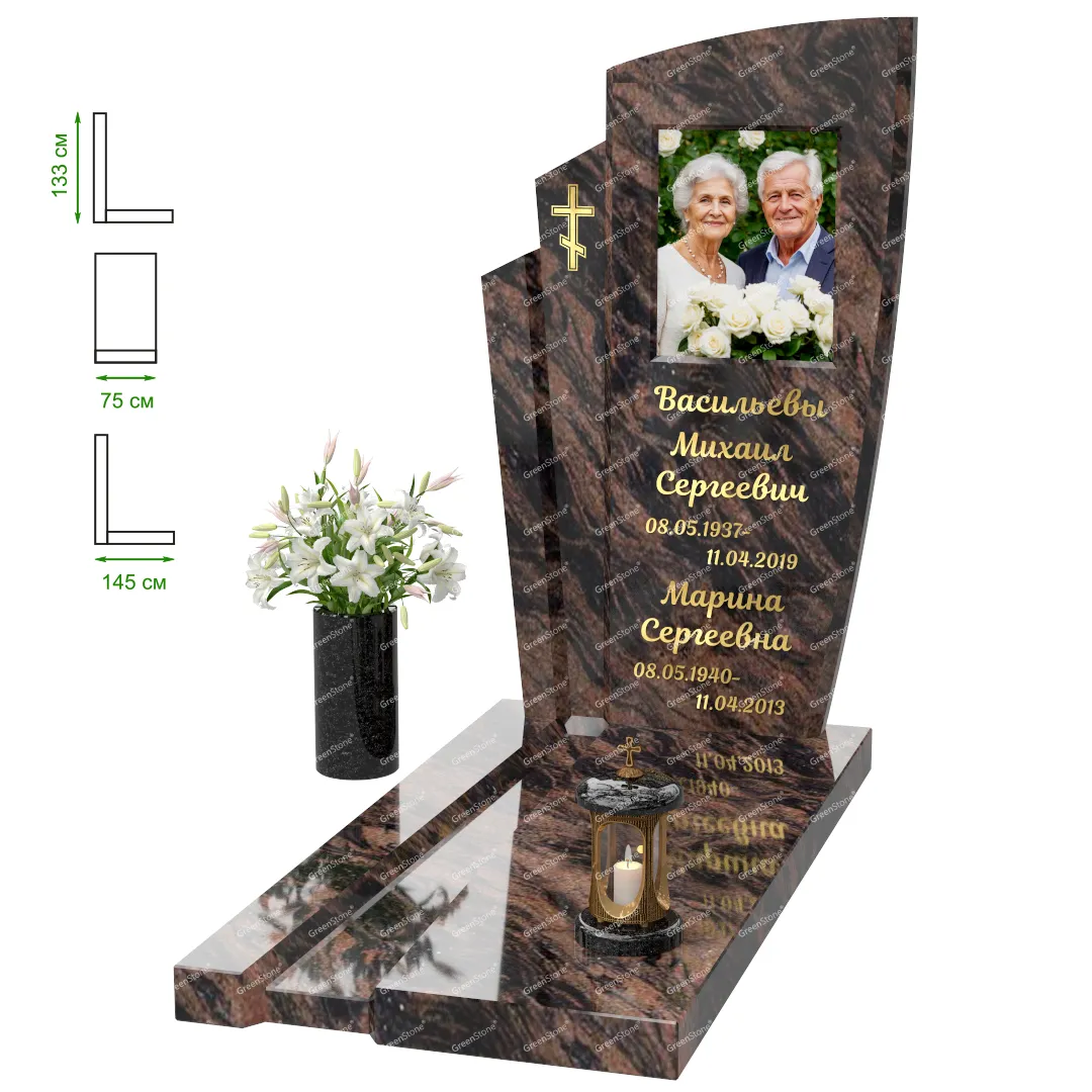 Визуально комплекс отличается от типовой формы не только формой, но и размерами. Массивная стела позволяет дизайнеру реализовать практически любые задумки и пожелания Заказчика, придать готовому изделию солидный вид, раскрыть все достоинства использованного в его изготовлении гранита. Такой габаритный памятник требует профессиональной доставки и установки. Все это также можно заказать в мастерской Грин-Стоун.
