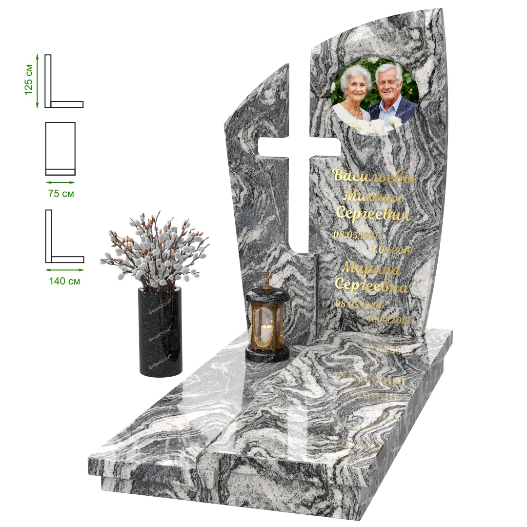 Визуально комплекс отличается от типовой формы не только формой, но и размерами. Массивная стела позволяет дизайнеру реализовать практически любые задумки и пожелания Заказчика, придать готовому изделию солидный вид, раскрыть все достоинства использованного в его изготовлении гранита. Такой габаритный памятник требует профессиональной доставки и установки. Все это также можно заказать в мастерской Грин-Стоун.