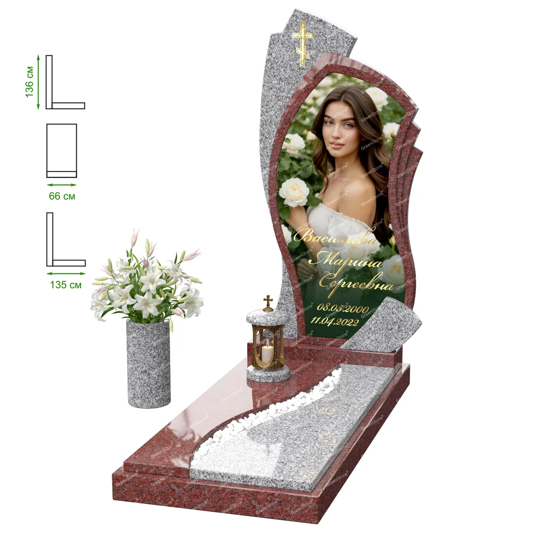 Визуально комплекс отличается от типовой формы не только формой, но и размерами. Массивная стела позволяет дизайнеру реализовать практически любые задумки и пожелания Заказчика, придать готовому изделию солидный вид, раскрыть все достоинства использованного в его изготовлении гранита. Такой габаритный памятник требует профессиональной доставки и установки. Все это также можно заказать в мастерской Грин-Стоун.