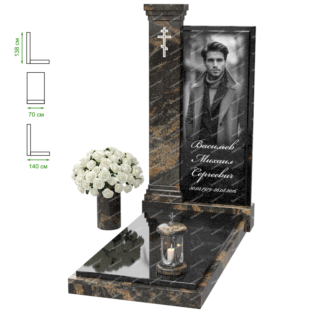 Визуально комплекс отличается от типовой формы не только формой, но и размерами. Массивная стела позволяет дизайнеру реализовать практически любые задумки и пожелания Заказчика, придать готовому изделию солидный вид, раскрыть все достоинства использованного в его изготовлении гранита. Такой габаритный памятник требует профессиональной доставки и установки. Все это также можно заказать в мастерской Грин-Стоун.