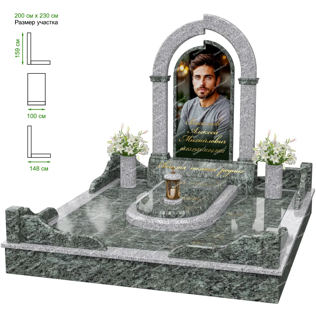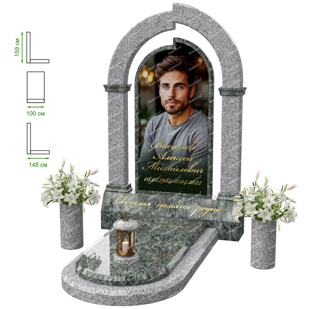 Визуально комплекс отличается от типовой формы не только формой, но и размерами. Массивная стела позволяет дизайнеру реализовать практически любые задумки и пожелания Заказчика, придать готовому изделию солидный вид, раскрыть все достоинства использованного в его изготовлении гранита. Такой габаритный памятник требует профессиональной доставки и установки. Все это также можно заказать в мастерской Грин-Стоун.