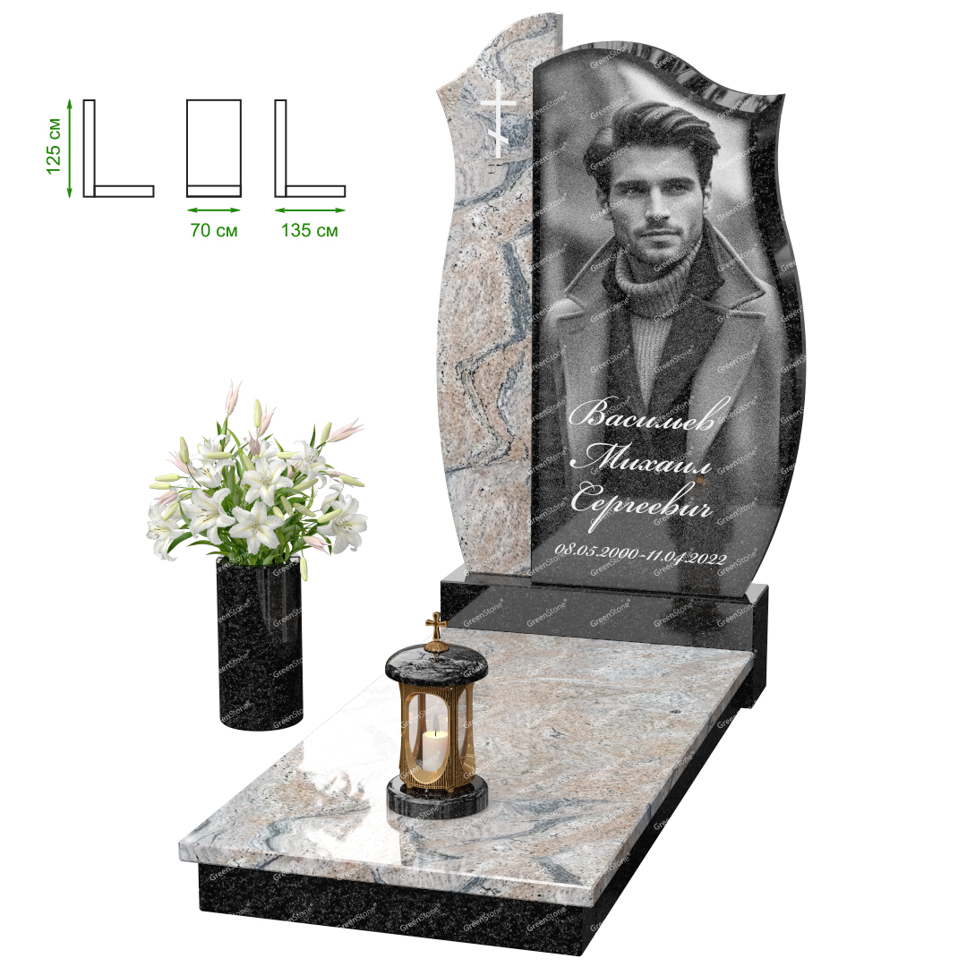 Визуально комплекс отличается от типовой формы не только формой, но и размерами. Массивная стела позволяет дизайнеру реализовать практически любые задумки и пожелания Заказчика, придать готовому изделию солидный вид, раскрыть все достоинства использованного в его изготовлении гранита. Такой габаритный памятник требует профессиональной доставки и установки. Все это также можно заказать в мастерской Грин-Стоун.