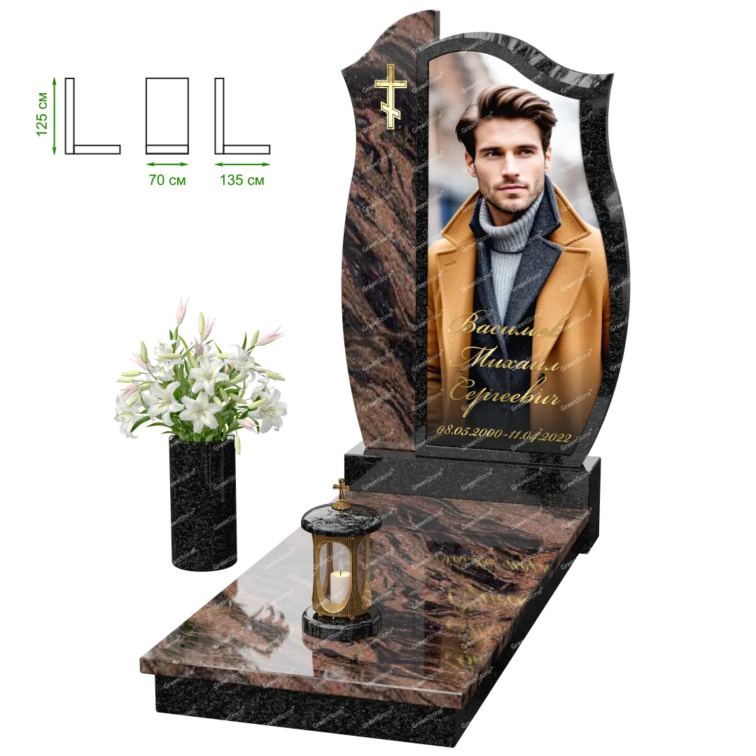 Визуально комплекс отличается от типовой формы не только формой, но и размерами. Массивная стела позволяет дизайнеру реализовать практически любые задумки и пожелания Заказчика, придать готовому изделию солидный вид, раскрыть все достоинства использованного в его изготовлении гранита. Такой габаритный памятник требует профессиональной доставки и установки. Все это также можно заказать в мастерской Грин-Стоун.
