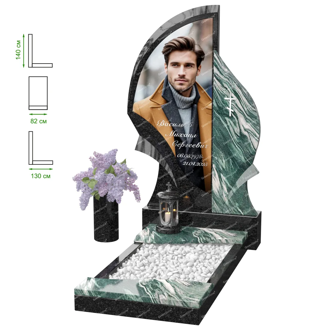 Визуально комплекс отличается от типовой формы не только формой, но и размерами. Массивная стела позволяет дизайнеру реализовать практически любые задумки и пожелания Заказчика, придать готовому изделию солидный вид, раскрыть все достоинства использованного в его изготовлении гранита. Такой габаритный памятник требует профессиональной доставки и установки. Все это также можно заказать в мастерской Грин-Стоун.