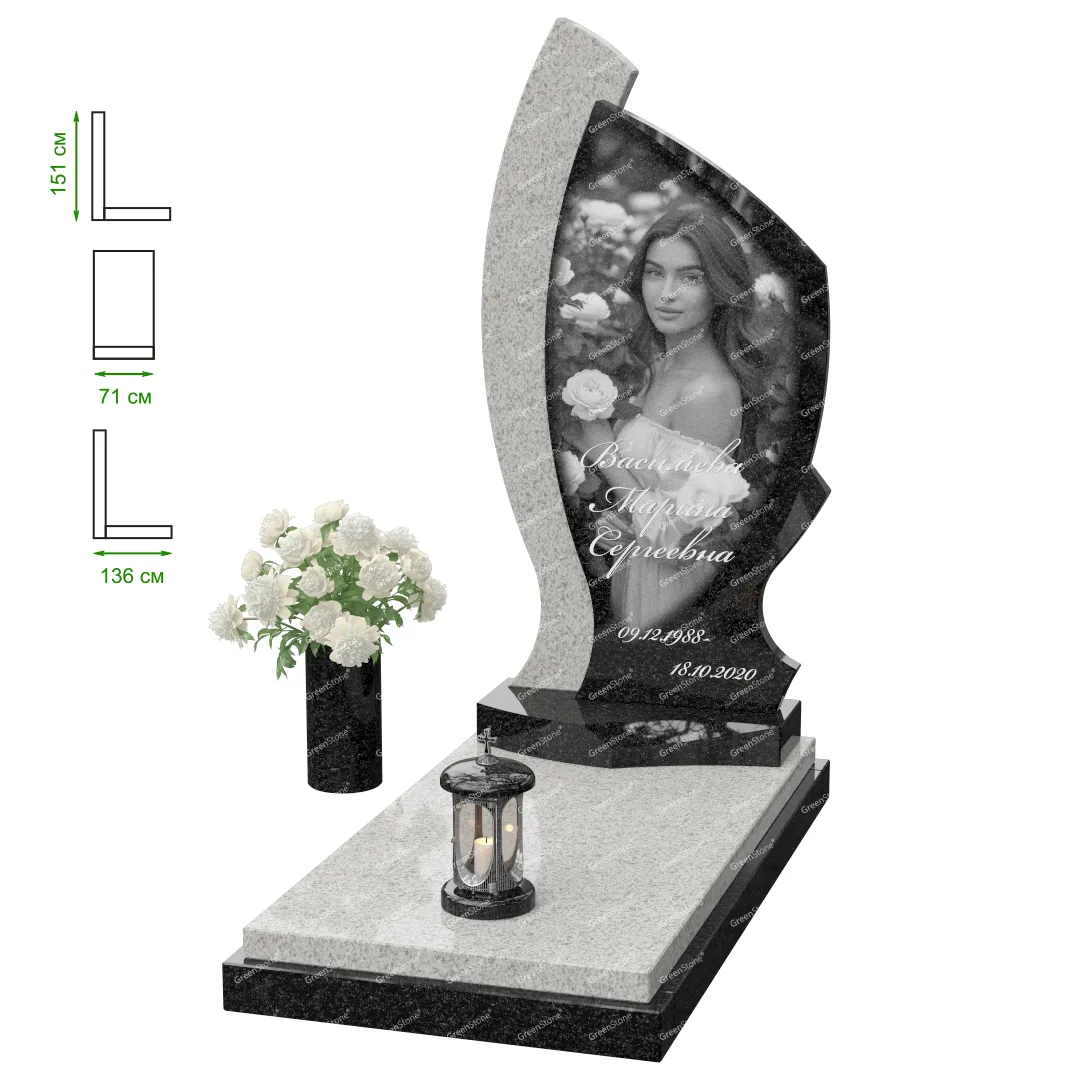 Визуально комплекс отличается от типовой формы не только формой, но и размерами. Массивная стела позволяет дизайнеру реализовать практически любые задумки и пожелания Заказчика, придать готовому изделию солидный вид, раскрыть все достоинства использованного в его изготовлении гранита. Такой габаритный памятник требует профессиональной доставки и установки. Все это также можно заказать в мастерской Грин-Стоун.
