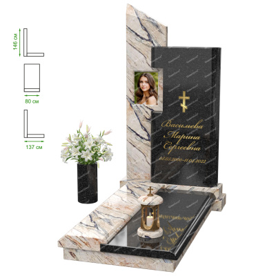 Визуально комплекс отличается от типовой формы не только формой, но и размерами. Массивная стела позволяет дизайнеру реализовать практически любые задумки и пожелания Заказчика, придать готовому изделию солидный вид, раскрыть все достоинства использованного в его изготовлении гранита. Такой габаритный памятник требует профессиональной доставки и установки. Все это также можно заказать в мастерской Грин-Стоун.