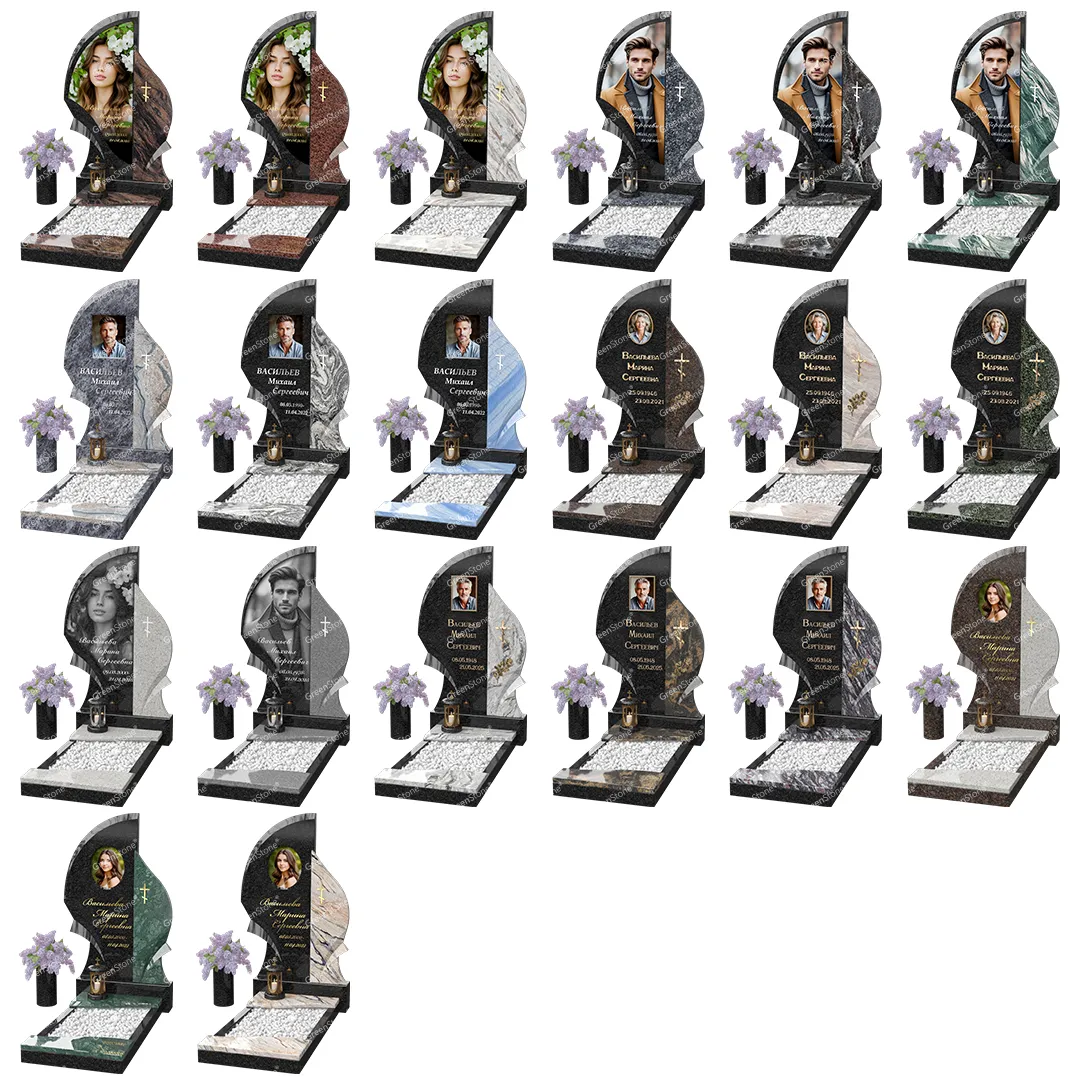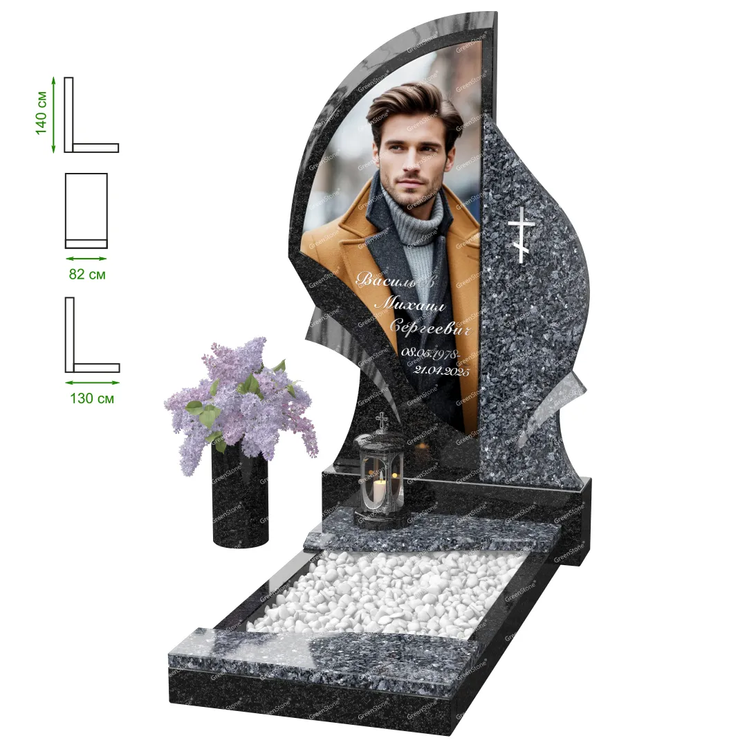 Визуально комплекс отличается от типовой формы не только формой, но и размерами. Массивная стела позволяет дизайнеру реализовать практически любые задумки и пожелания Заказчика, придать готовому изделию солидный вид, раскрыть все достоинства использованного в его изготовлении гранита. Такой габаритный памятник требует профессиональной доставки и установки. Все это также можно заказать в мастерской Грин-Стоун.