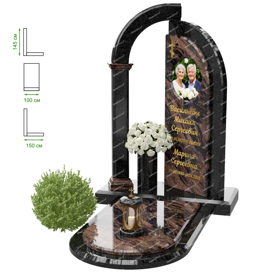 Визуально комплекс отличается от типовой формы не только формой, но и размерами. Массивная стела позволяет дизайнеру реализовать практически любые задумки и пожелания Заказчика, придать готовому изделию солидный вид, раскрыть все достоинства использованного в его изготовлении гранита. Такой габаритный памятник требует профессиональной доставки и установки. Все это также можно заказать в мастерской Грин-Стоун.
