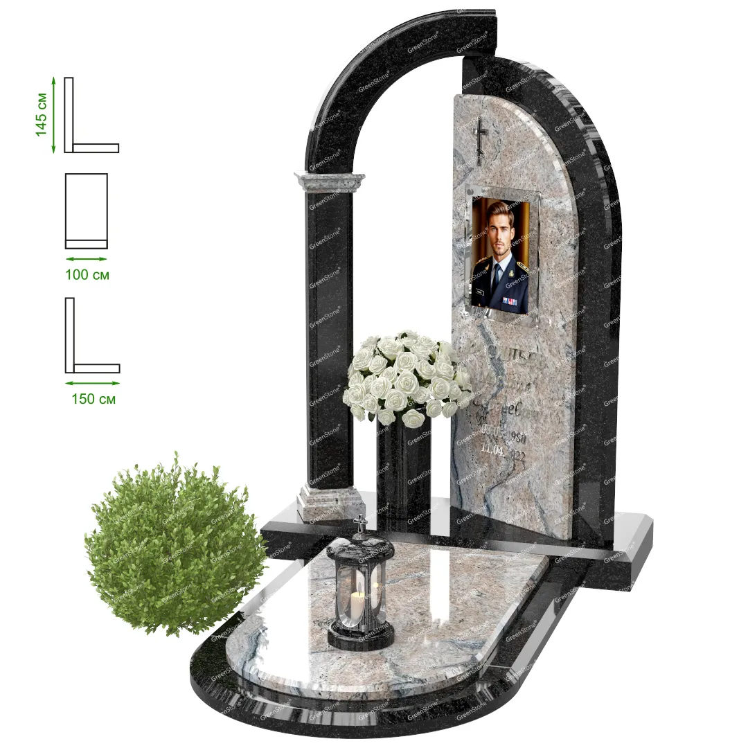 Визуально комплекс отличается от типовой формы не только формой, но и размерами. Массивная стела позволяет дизайнеру реализовать практически любые задумки и пожелания Заказчика, придать готовому изделию солидный вид, раскрыть все достоинства использованного в его изготовлении гранита. Такой габаритный памятник требует профессиональной доставки и установки. Все это также можно заказать в мастерской Грин-Стоун.
