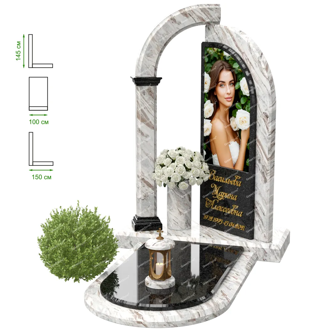 Визуально комплекс отличается от типовой формы не только формой, но и размерами. Массивная стела позволяет дизайнеру реализовать практически любые задумки и пожелания Заказчика, придать готовому изделию солидный вид, раскрыть все достоинства использованного в его изготовлении гранита. Такой габаритный памятник требует профессиональной доставки и установки. Все это также можно заказать в мастерской Грин-Стоун.