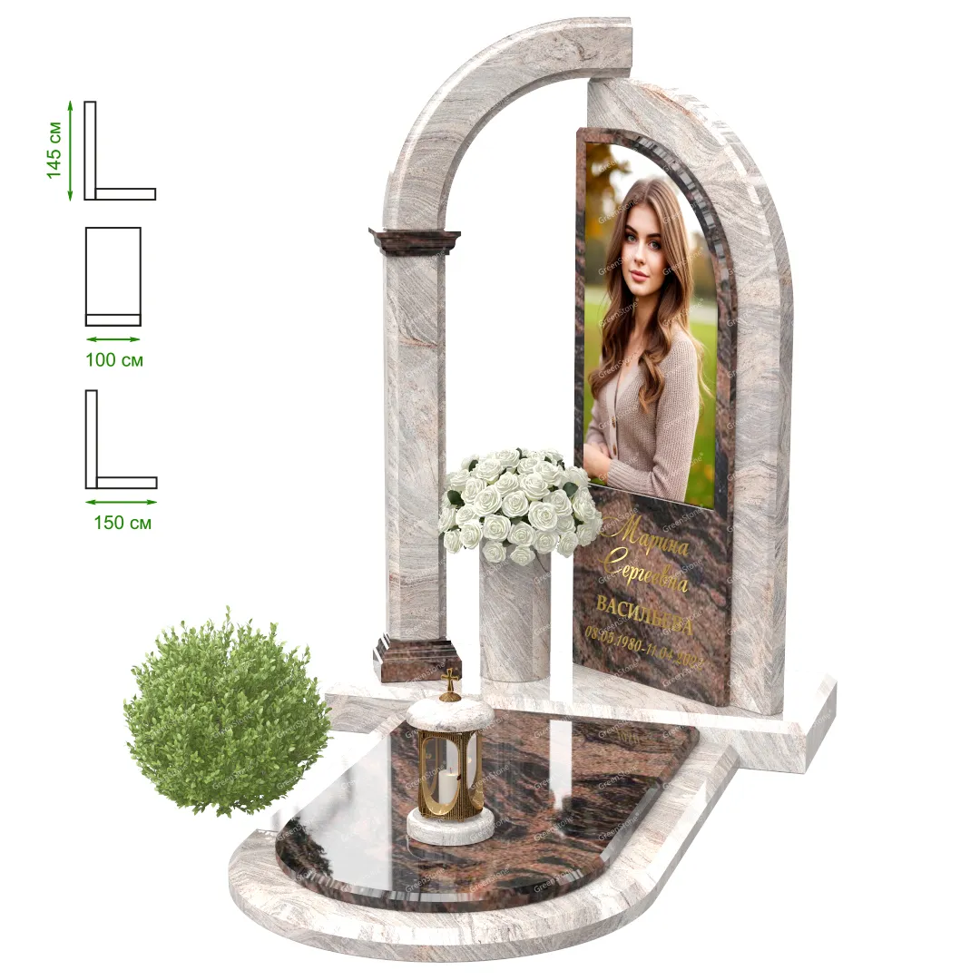 Визуально комплекс отличается от типовой формы не только формой, но и размерами. Массивная стела позволяет дизайнеру реализовать практически любые задумки и пожелания Заказчика, придать готовому изделию солидный вид, раскрыть все достоинства использованного в его изготовлении гранита. Такой габаритный памятник требует профессиональной доставки и установки. Все это также можно заказать в мастерской Грин-Стоун.