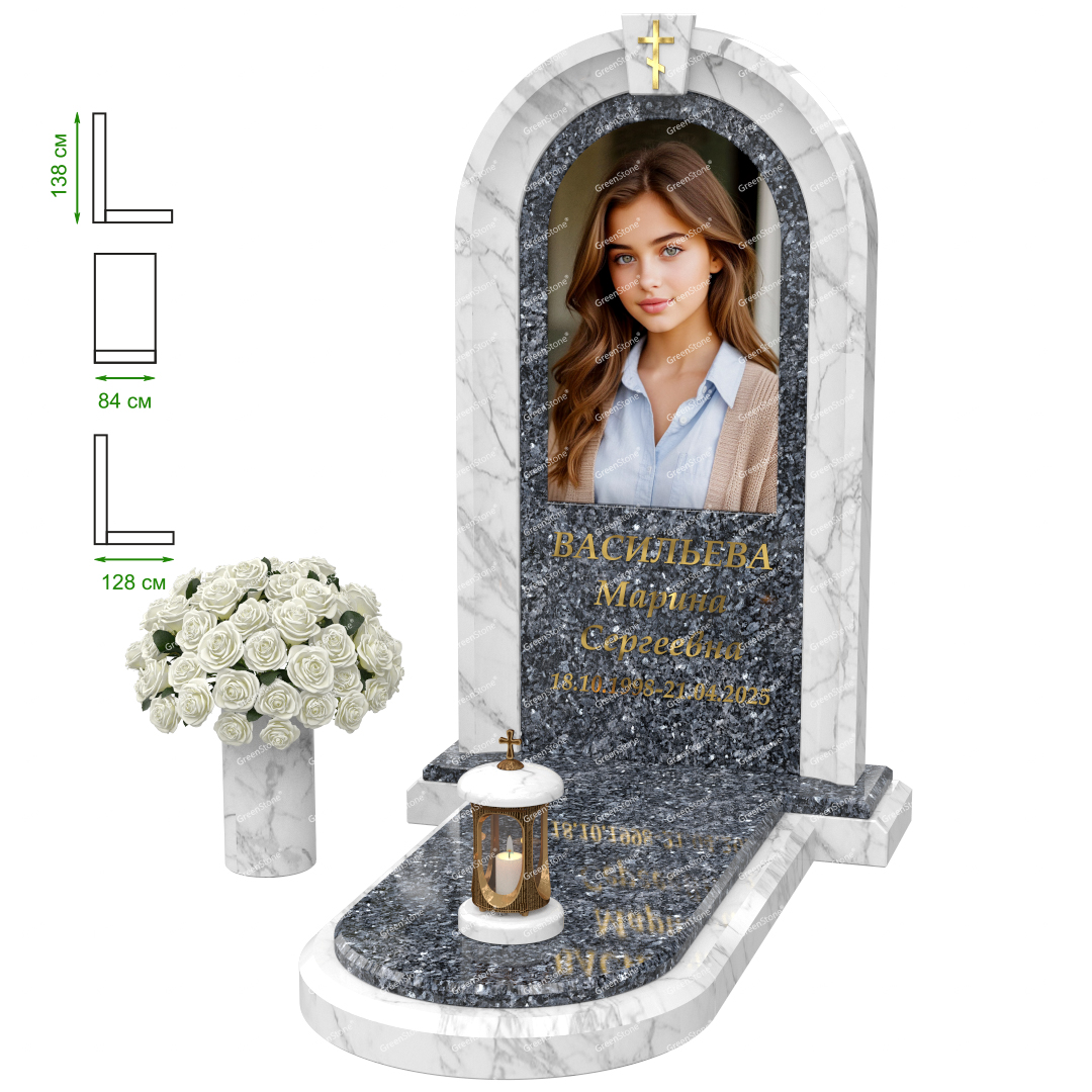 Визуально комплекс отличается от типовой формы не только формой, но и размерами. Массивная стела позволяет дизайнеру реализовать практически любые задумки и пожелания Заказчика, придать готовому изделию солидный вид, раскрыть все достоинства использованного в его изготовлении гранита. Такой габаритный памятник требует профессиональной доставки и установки. Все это также можно заказать в мастерской Грин-Стоун.