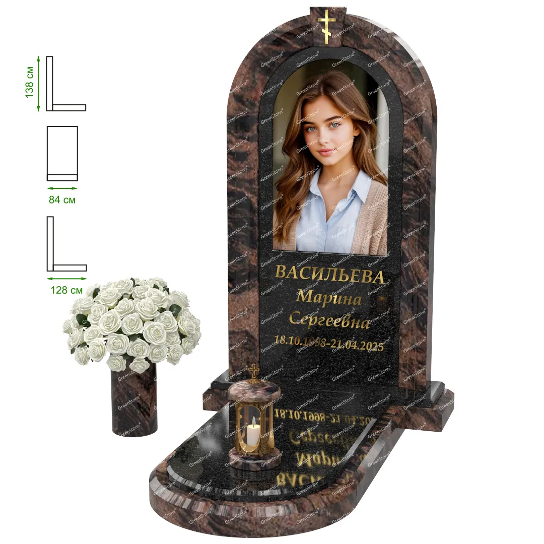 Визуально комплекс отличается от типовой формы не только формой, но и размерами. Массивная стела позволяет дизайнеру реализовать практически любые задумки и пожелания Заказчика, придать готовому изделию солидный вид, раскрыть все достоинства использованного в его изготовлении гранита. Такой габаритный памятник требует профессиональной доставки и установки. Все это также можно заказать в мастерской Грин-Стоун.
