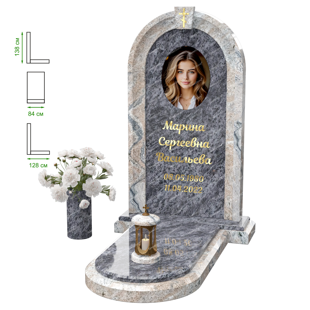 Визуально комплекс отличается от типовой формы не только формой, но и размерами. Массивная стела позволяет дизайнеру реализовать практически любые задумки и пожелания Заказчика, придать готовому изделию солидный вид, раскрыть все достоинства использованного в его изготовлении гранита. Такой габаритный памятник требует профессиональной доставки и установки. Все это также можно заказать в мастерской Грин-Стоун.