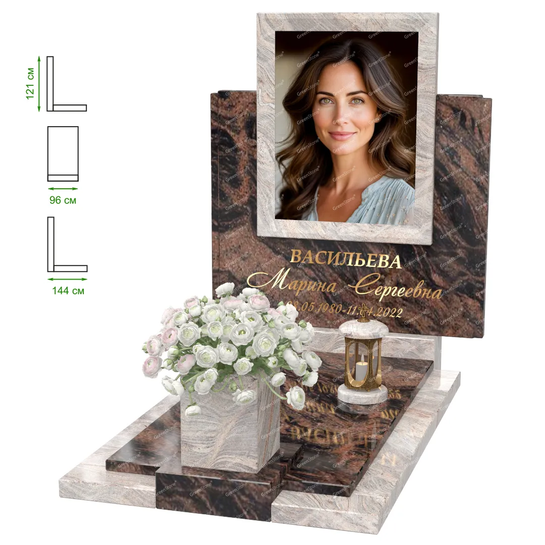 Визуально комплекс отличается от типовой формы не только формой, но и размерами. Массивная стела позволяет дизайнеру реализовать практически любые задумки и пожелания Заказчика, придать готовому изделию солидный вид, раскрыть все достоинства использованного в его изготовлении гранита. Такой габаритный памятник требует профессиональной доставки и установки. Все это также можно заказать в мастерской Грин-Стоун.