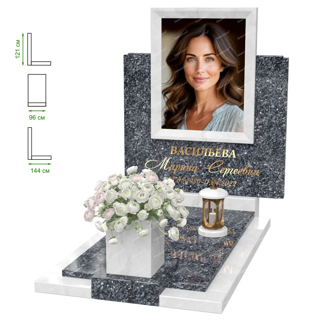 Визуально комплекс отличается от типовой формы не только формой, но и размерами. Массивная стела позволяет дизайнеру реализовать практически любые задумки и пожелания Заказчика, придать готовому изделию солидный вид, раскрыть все достоинства использованного в его изготовлении гранита. Такой габаритный памятник требует профессиональной доставки и установки. Все это также можно заказать в мастерской Грин-Стоун.