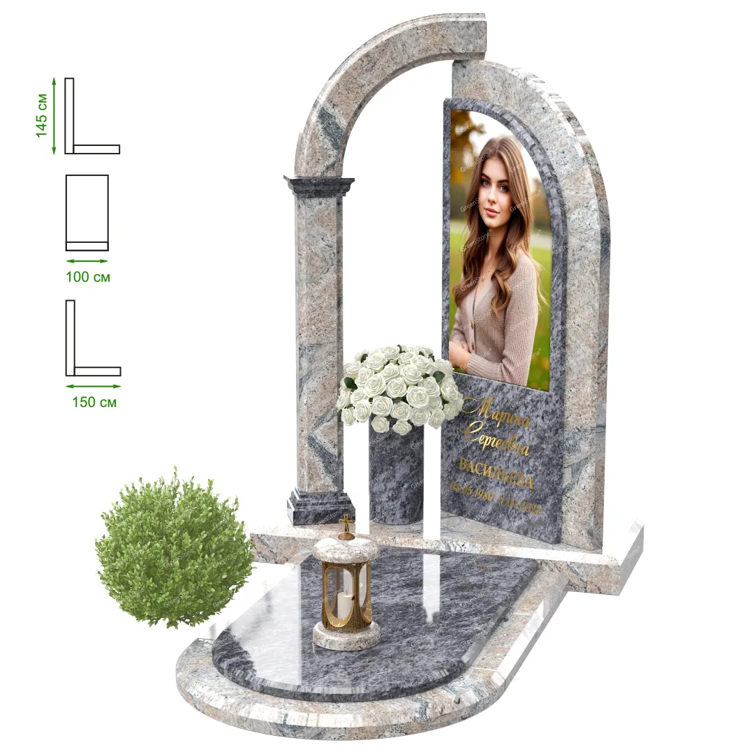 Визуально комплекс отличается от типовой формы не только формой, но и размерами. Массивная стела позволяет дизайнеру реализовать практически любые задумки и пожелания Заказчика, придать готовому изделию солидный вид, раскрыть все достоинства использованного в его изготовлении гранита. Такой габаритный памятник требует профессиональной доставки и установки. Все это также можно заказать в мастерской Грин-Стоун.