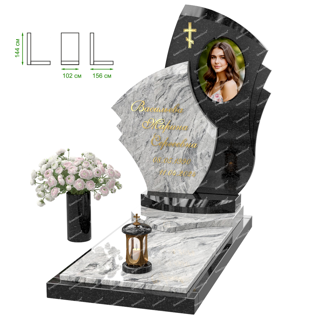 Визуально комплекс отличается от типовой формы не только формой, но и размерами. Массивная стела позволяет дизайнеру реализовать практически любые задумки и пожелания Заказчика, придать готовому изделию солидный вид, раскрыть все достоинства использованного в его изготовлении гранита. Такой габаритный памятник требует профессиональной доставки и установки. Все это также можно заказать в мастерской Грин-Стоун.