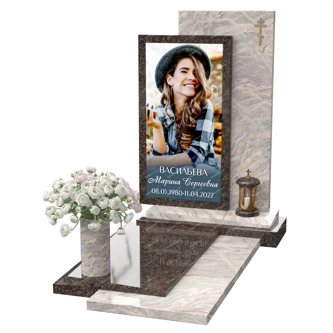 Визуально комплекс отличается от типовой формы не только формой, но и размерами. Массивная стела позволяет дизайнеру реализовать практически любые задумки и пожелания Заказчика, придать готовому изделию солидный вид, раскрыть все достоинства использованного в его изготовлении гранита. Такой габаритный памятник требует профессиональной доставки и установки. Все это также можно заказать в мастерской Грин-Стоун.