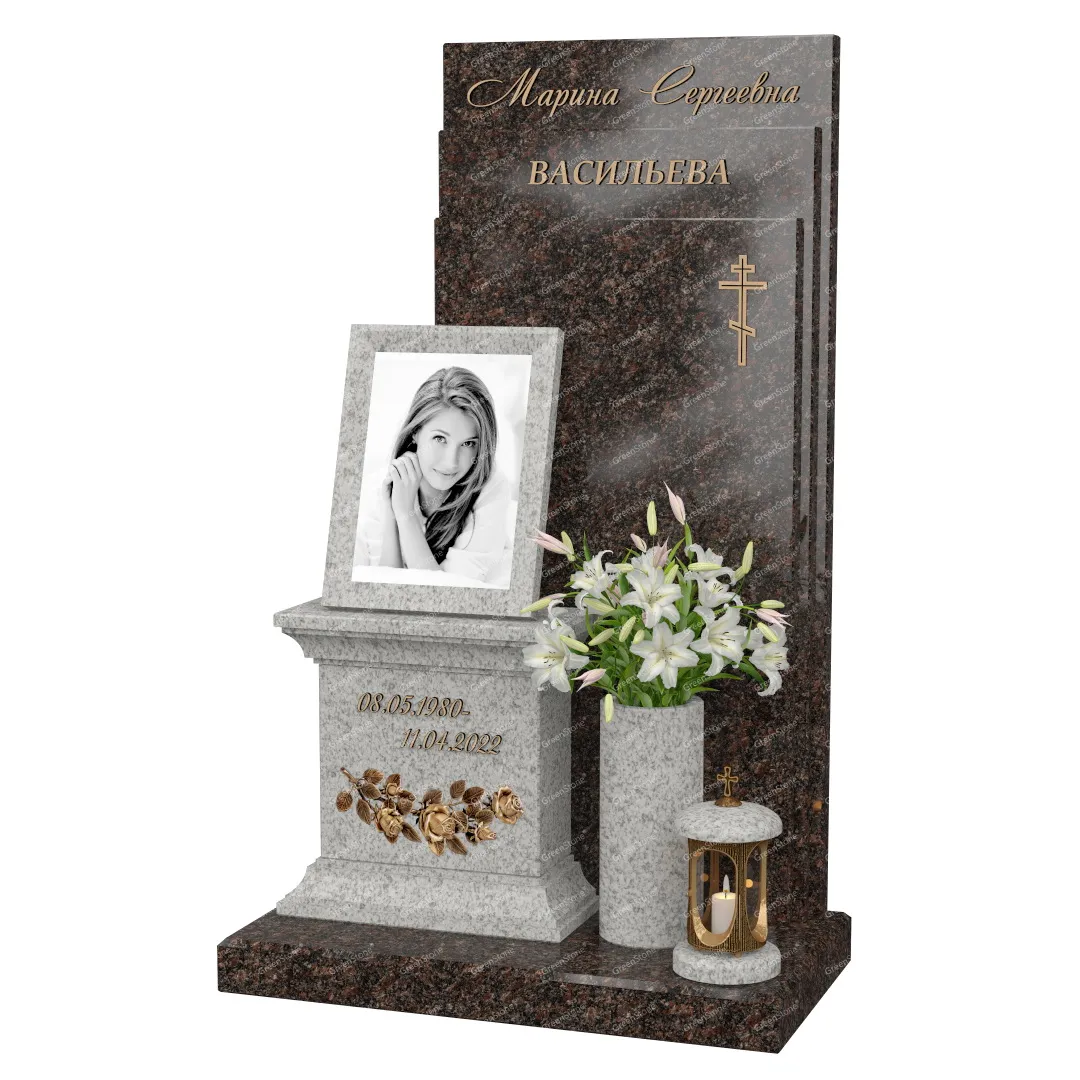 Визуально комплекс отличается от типовой формы не только формой, но и размерами. Массивная стела позволяет дизайнеру реализовать практически любые задумки и пожелания Заказчика, придать готовому изделию солидный вид, раскрыть все достоинства использованного в его изготовлении гранита. Такой габаритный памятник требует профессиональной доставки и установки. Все это также можно заказать в мастерской Грин-Стоун.