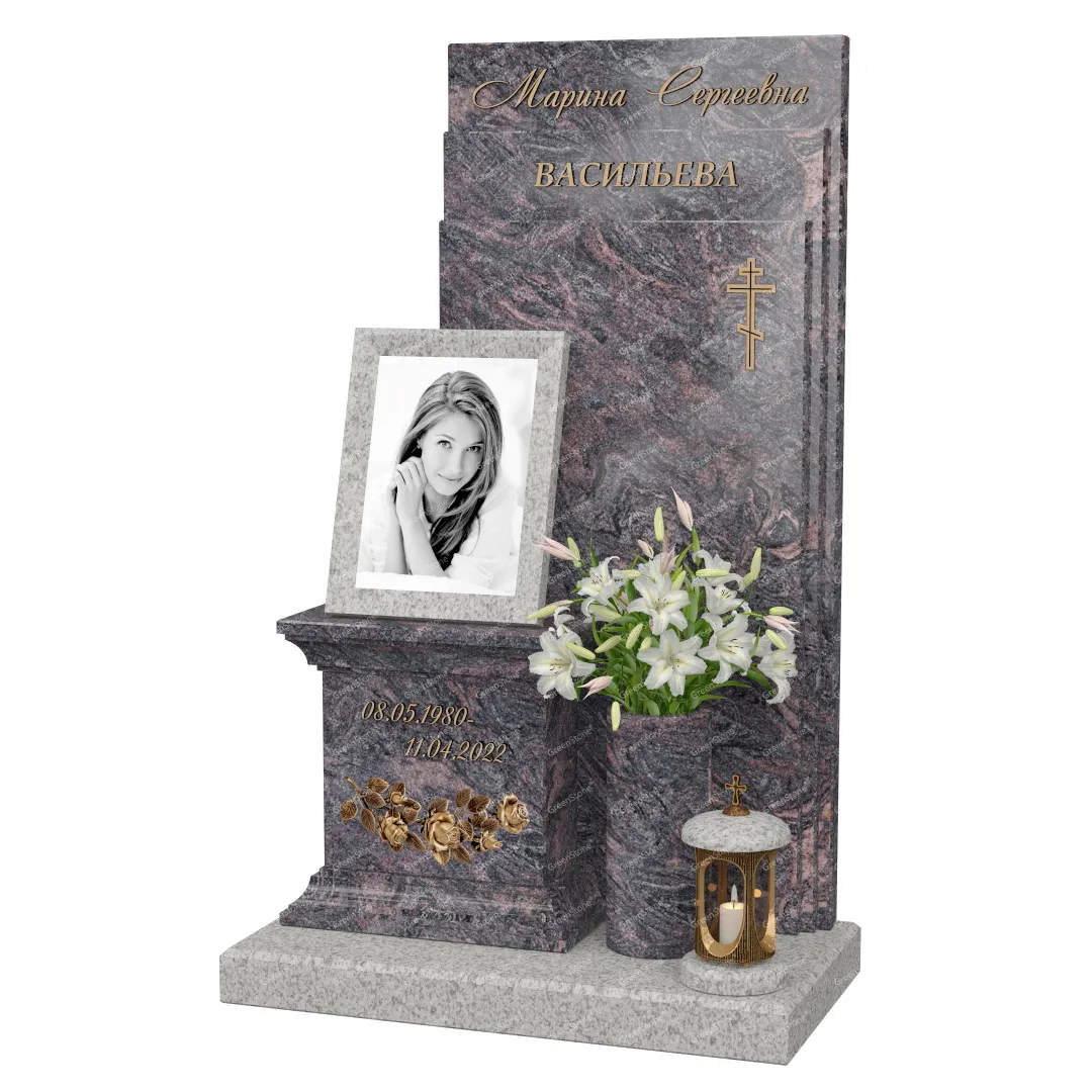 Визуально комплекс отличается от типовой формы не только формой, но и размерами. Массивная стела позволяет дизайнеру реализовать практически любые задумки и пожелания Заказчика, придать готовому изделию солидный вид, раскрыть все достоинства использованного в его изготовлении гранита. Такой габаритный памятник требует профессиональной доставки и установки. Все это также можно заказать в мастерской Грин-Стоун.