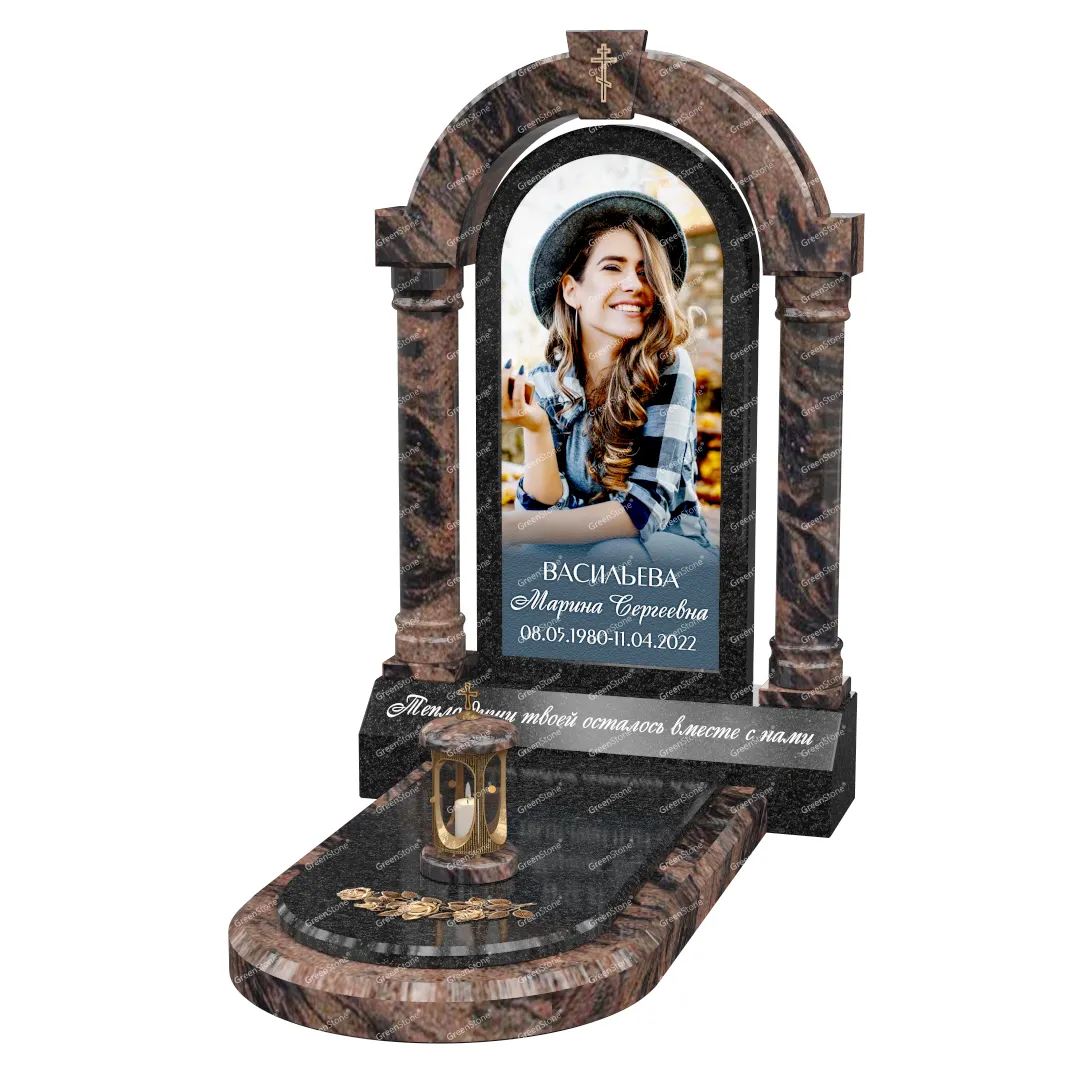 Визуально комплекс отличается от типовой формы не только формой, но и размерами. Массивная стела позволяет дизайнеру реализовать практически любые задумки и пожелания Заказчика, придать готовому изделию солидный вид, раскрыть все достоинства использованного в его изготовлении гранита. Такой габаритный памятник требует профессиональной доставки и установки. Все это также можно заказать в мастерской Грин-Стоун.