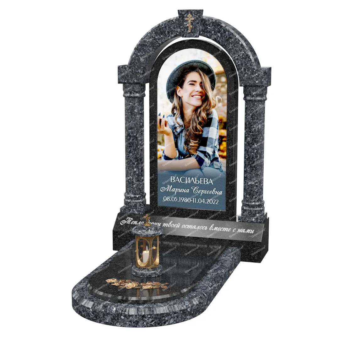 Визуально комплекс отличается от типовой формы не только формой, но и размерами. Массивная стела позволяет дизайнеру реализовать практически любые задумки и пожелания Заказчика, придать готовому изделию солидный вид, раскрыть все достоинства использованного в его изготовлении гранита. Такой габаритный памятник требует профессиональной доставки и установки. Все это также можно заказать в мастерской Грин-Стоун.