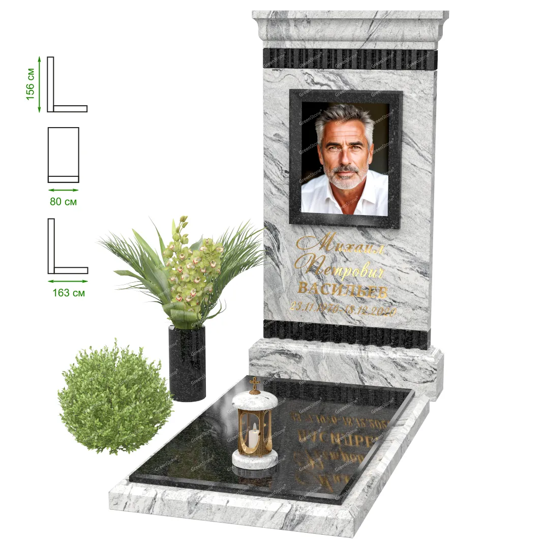 Визуально комплекс отличается от типовой формы не только формой, но и размерами. Массивная стела позволяет дизайнеру реализовать практически любые задумки и пожелания Заказчика, придать готовому изделию солидный вид, раскрыть все достоинства использованного в его изготовлении гранита. Такой габаритный памятник требует профессиональной доставки и установки. Все это также можно заказать в мастерской Грин-Стоун.
