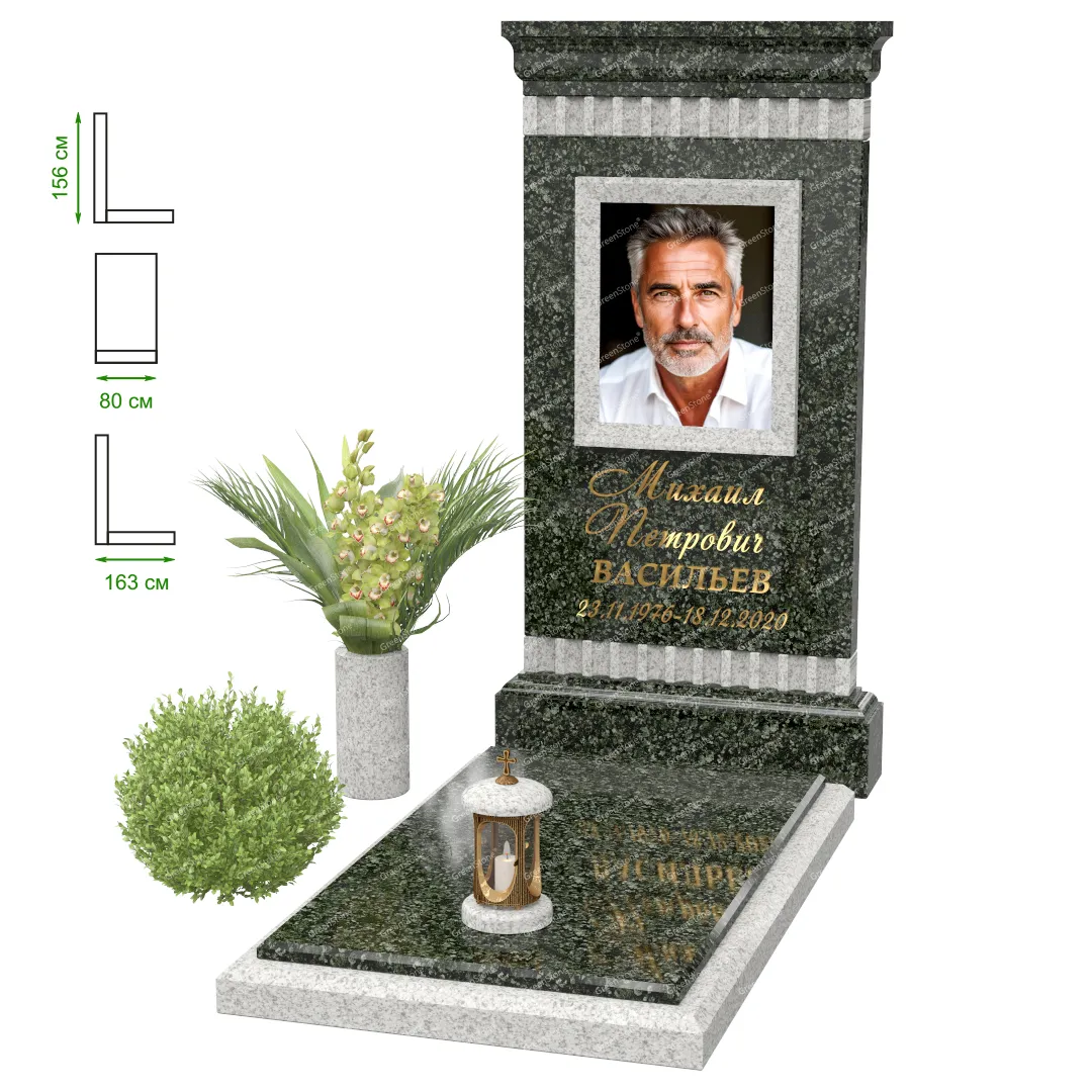 Визуально комплекс отличается от типовой формы не только формой, но и размерами. Массивная стела позволяет дизайнеру реализовать практически любые задумки и пожелания Заказчика, придать готовому изделию солидный вид, раскрыть все достоинства использованного в его изготовлении гранита. Такой габаритный памятник требует профессиональной доставки и установки. Все это также можно заказать в мастерской Грин-Стоун.