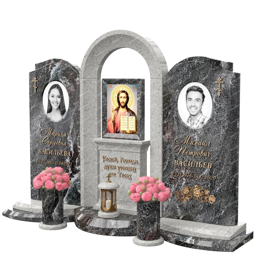 Визуально комплекс отличается от типовой формы не только формой, но и размерами. Массивная стела позволяет дизайнеру реализовать практически любые задумки и пожелания Заказчика, придать готовому изделию солидный вид, раскрыть все достоинства использованного в его изготовлении гранита. Такой габаритный памятник требует профессиональной доставки и установки. Все это также можно заказать в мастерской Грин-Стоун.