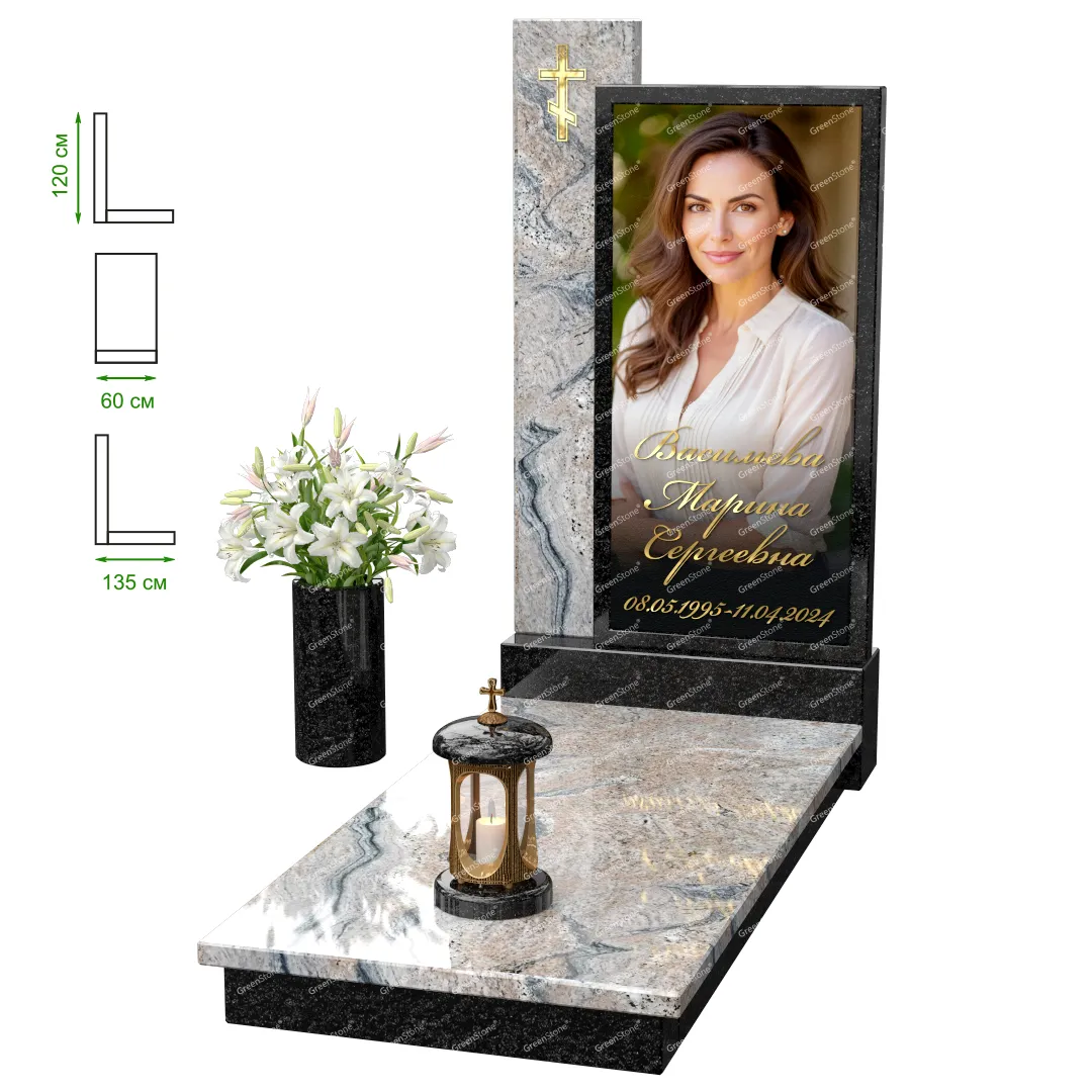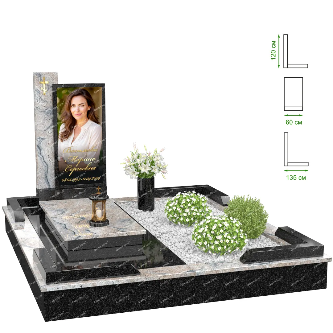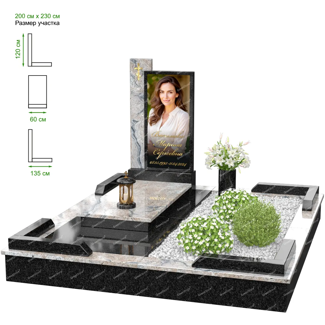 Визуально комплекс отличается от типовой формы не только формой, но и размерами. Массивная стела позволяет дизайнеру реализовать практически любые задумки и пожелания Заказчика, придать готовому изделию солидный вид, раскрыть все достоинства использованного в его изготовлении гранита. Такой габаритный памятник требует профессиональной доставки и установки. Все это также можно заказать в мастерской Грин-Стоун.