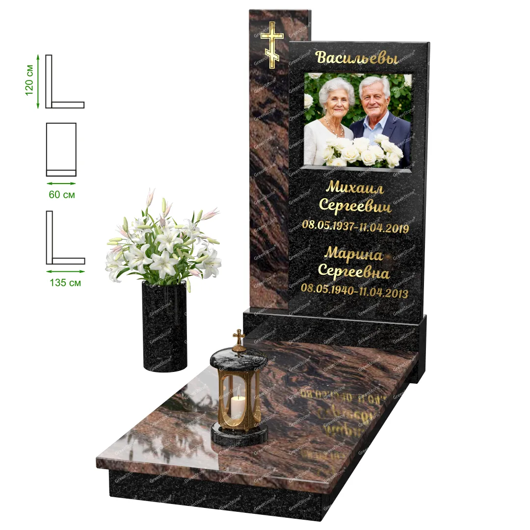 Визуально комплекс отличается от типовой формы не только формой, но и размерами. Массивная стела позволяет дизайнеру реализовать практически любые задумки и пожелания Заказчика, придать готовому изделию солидный вид, раскрыть все достоинства использованного в его изготовлении гранита. Такой габаритный памятник требует профессиональной доставки и установки. Все это также можно заказать в мастерской Грин-Стоун.