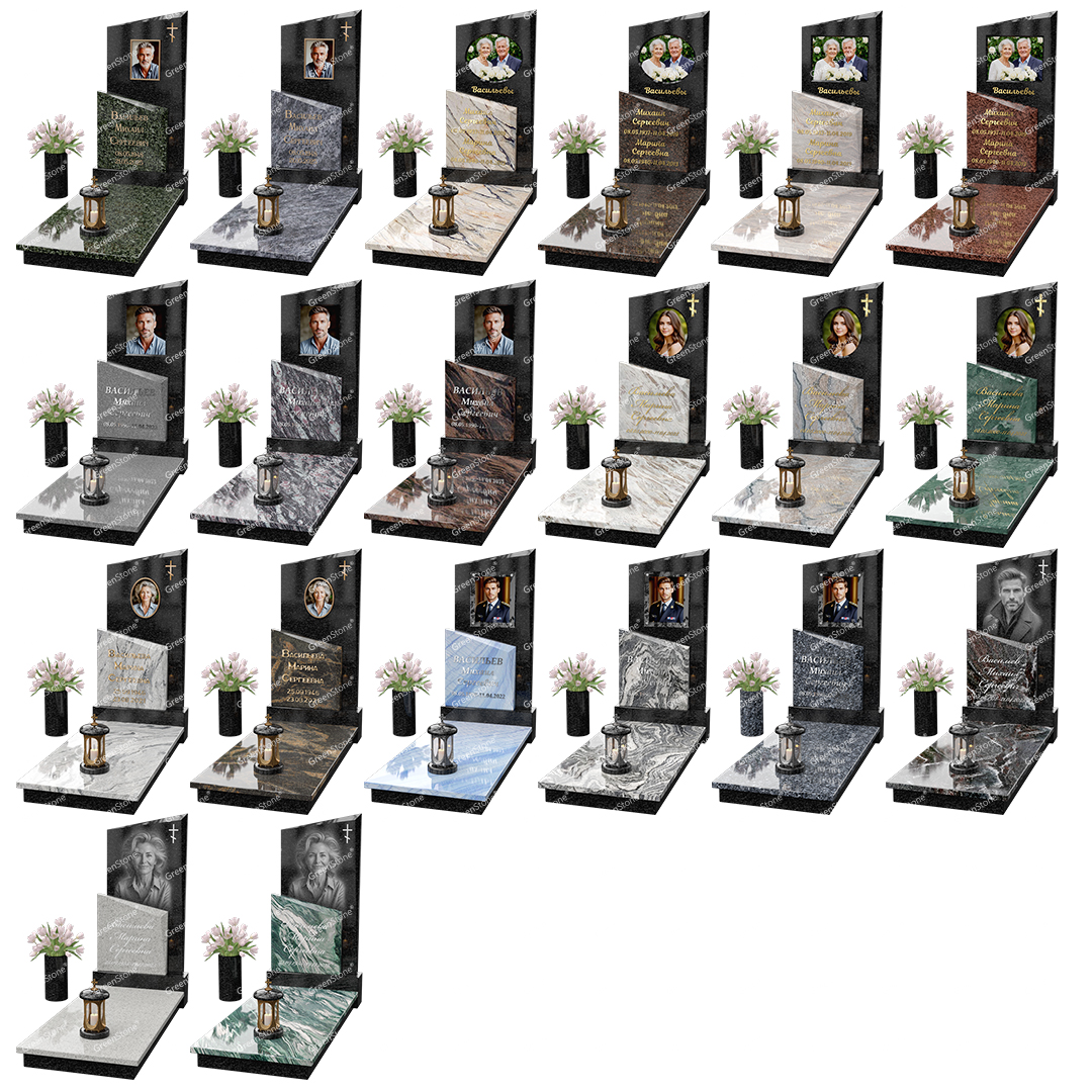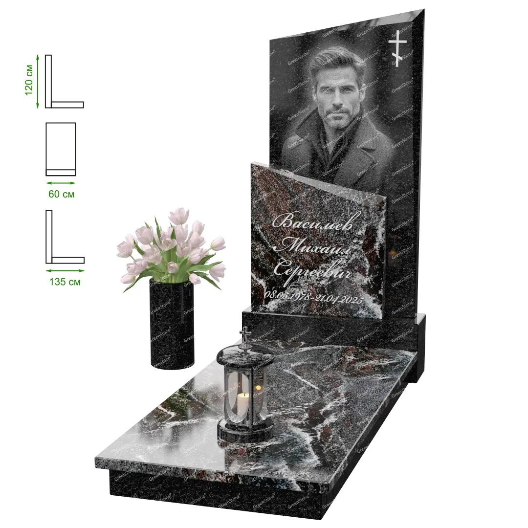 Визуально комплекс отличается от типовой формы не только формой, но и размерами. Массивная стела позволяет дизайнеру реализовать практически любые задумки и пожелания Заказчика, придать готовому изделию солидный вид, раскрыть все достоинства использованного в его изготовлении гранита. Такой габаритный памятник требует профессиональной доставки и установки. Все это также можно заказать в мастерской Грин-Стоун.