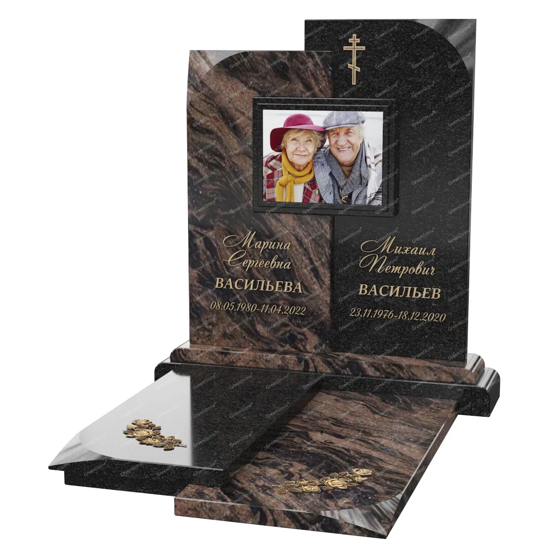 Визуально комплекс отличается от типовой формы не только формой, но и размерами. Массивная стела позволяет дизайнеру реализовать практически любые задумки и пожелания Заказчика, придать готовому изделию солидный вид, раскрыть все достоинства использованного в его изготовлении гранита. Такой габаритный памятник требует профессиональной доставки и установки. Все это также можно заказать в мастерской Грин-Стоун.