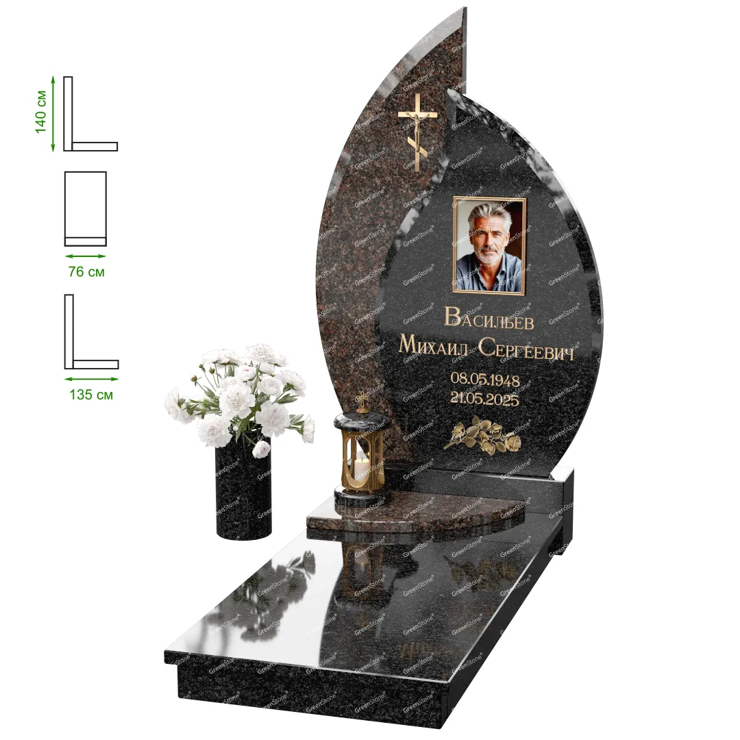 Визуально комплекс отличается от типовой формы не только формой, но и размерами. Массивная стела позволяет дизайнеру реализовать практически любые задумки и пожелания Заказчика, придать готовому изделию солидный вид, раскрыть все достоинства использованного в его изготовлении гранита. Такой габаритный памятник требует профессиональной доставки и установки. Все это также можно заказать в мастерской Грин-Стоун.