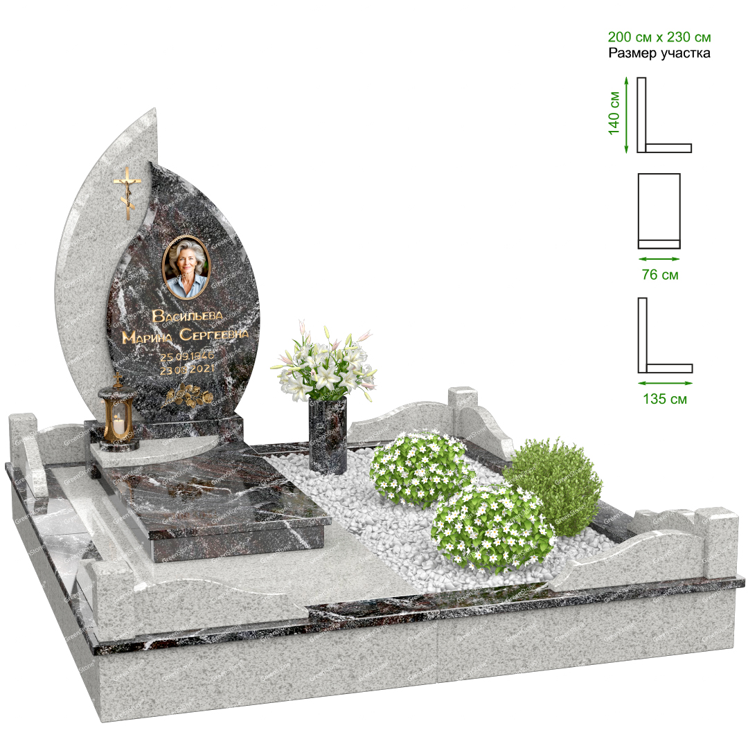 Визуально комплекс отличается от типовой формы не только формой, но и размерами. Массивная стела позволяет дизайнеру реализовать практически любые задумки и пожелания Заказчика, придать готовому изделию солидный вид, раскрыть все достоинства использованного в его изготовлении гранита. Такой габаритный памятник требует профессиональной доставки и установки. Все это также можно заказать в мастерской Грин-Стоун.