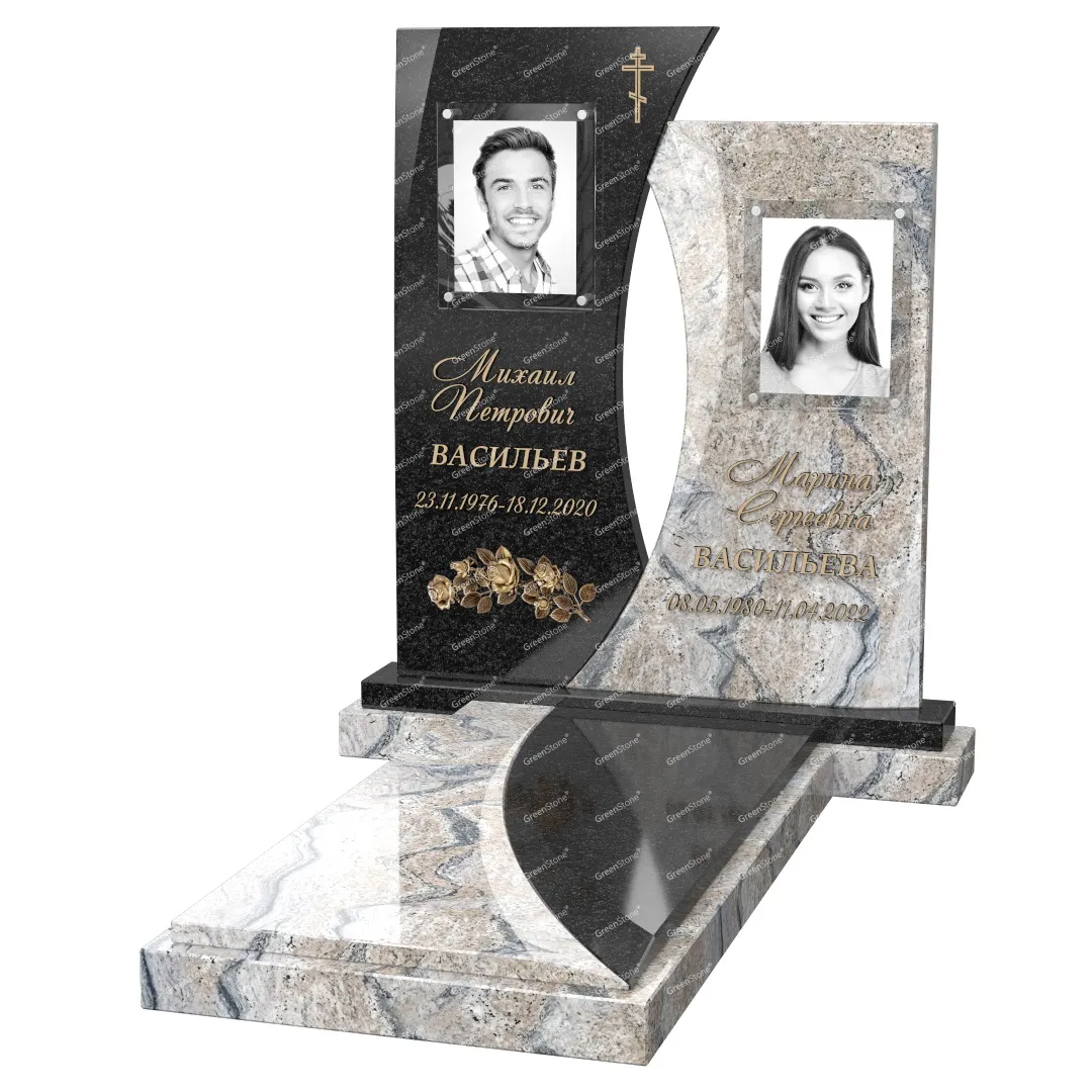 Визуально комплекс отличается от типовой формы не только формой, но и размерами. Массивная стела позволяет дизайнеру реализовать практически любые задумки и пожелания Заказчика, придать готовому изделию солидный вид, раскрыть все достоинства использованного в его изготовлении гранита. Такой габаритный памятник требует профессиональной доставки и установки. Все это также можно заказать в мастерской Грин-Стоун.