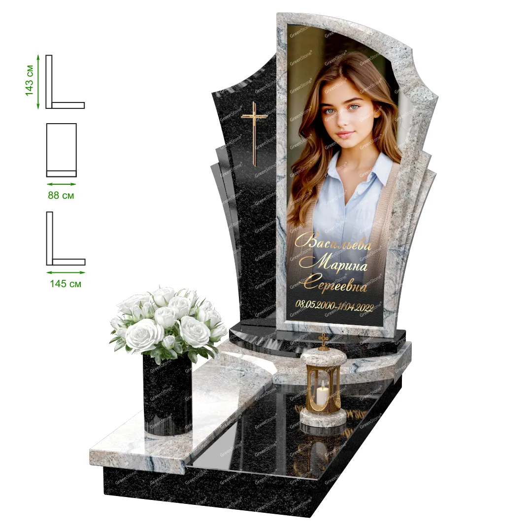 Визуально комплекс отличается от типовой формы не только формой, но и размерами. Массивная стела позволяет дизайнеру реализовать практически любые задумки и пожелания Заказчика, придать готовому изделию солидный вид, раскрыть все достоинства использованного в его изготовлении гранита. Такой габаритный памятник требует профессиональной доставки и установки. Все это также можно заказать в мастерской Грин-Стоун.
