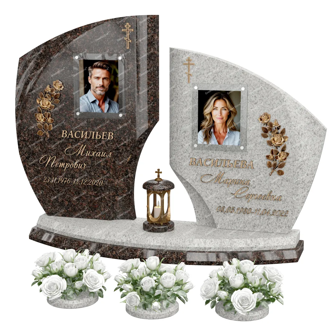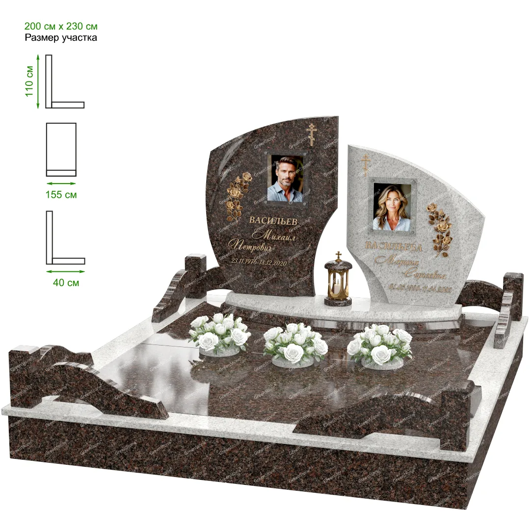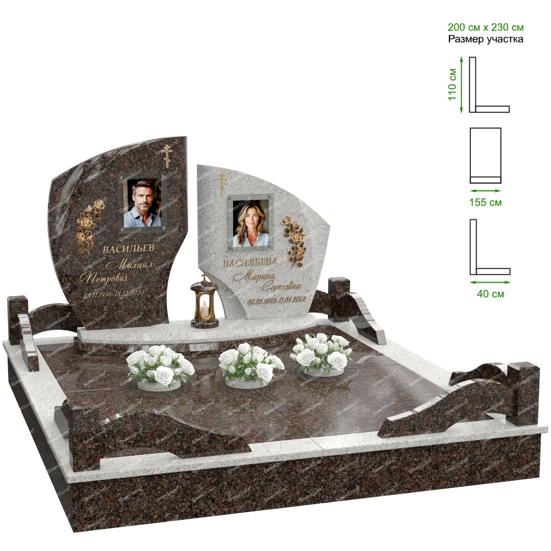Визуально комплекс отличается от типовой формы не только формой, но и размерами. Массивная стела позволяет дизайнеру реализовать практически любые задумки и пожелания Заказчика, придать готовому изделию солидный вид, раскрыть все достоинства использованного в его изготовлении гранита. Такой габаритный памятник требует профессиональной доставки и установки. Все это также можно заказать в мастерской Грин-Стоун.