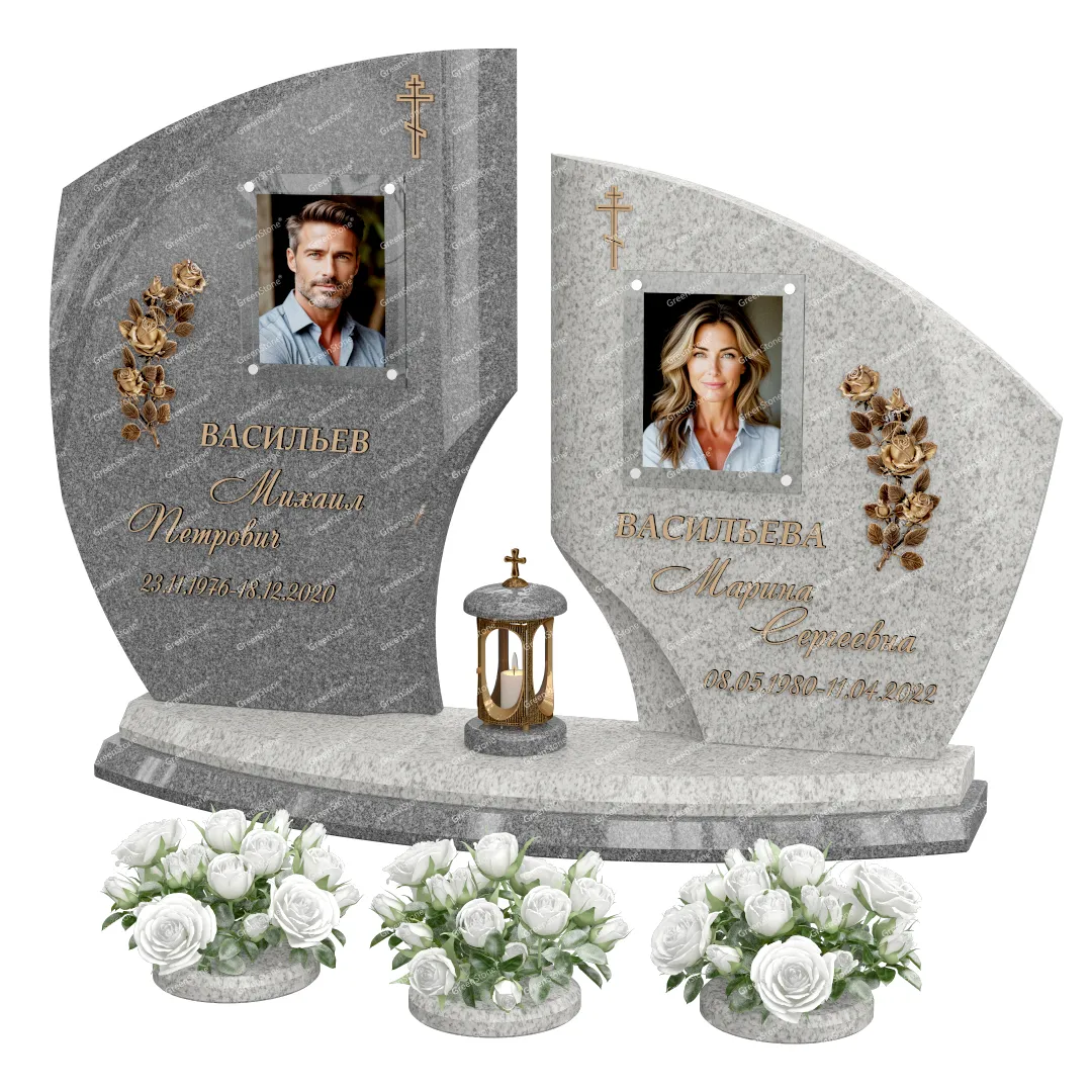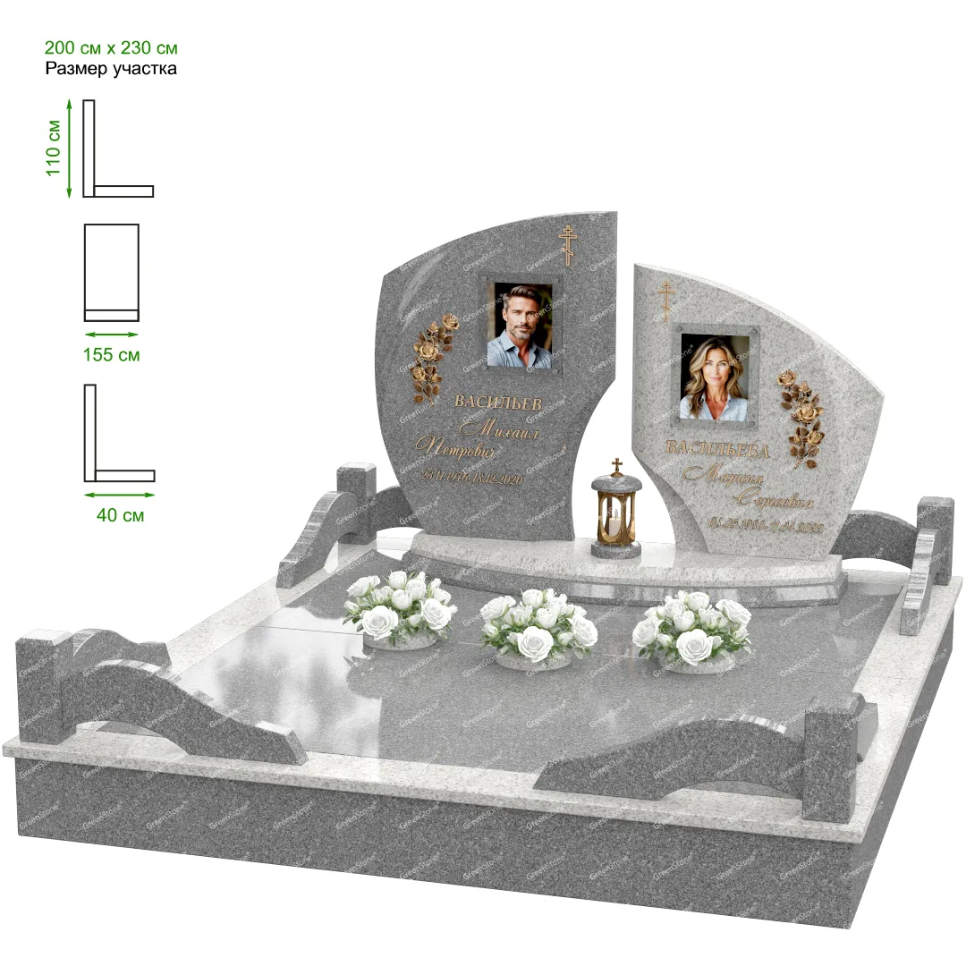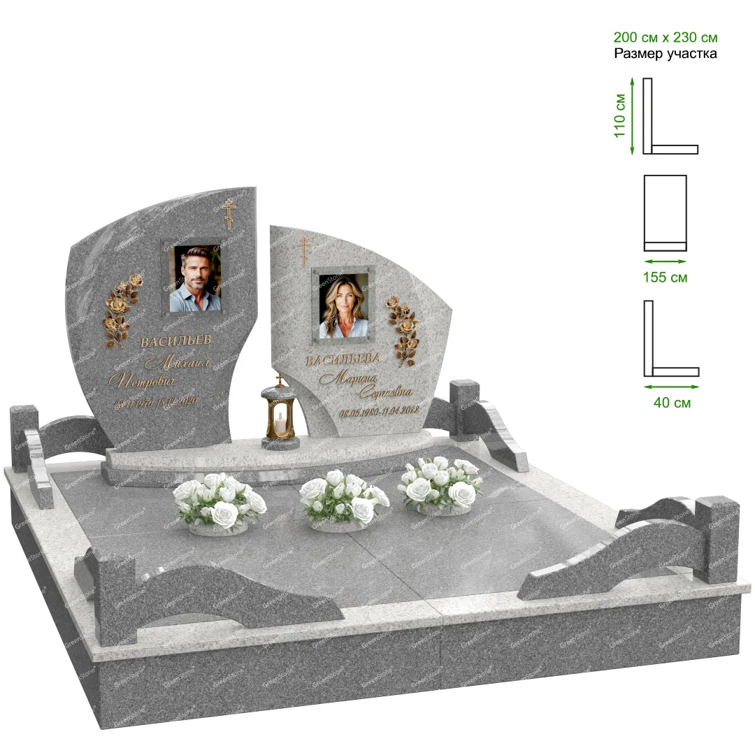 Визуально комплекс отличается от типовой формы не только формой, но и размерами. Массивная стела позволяет дизайнеру реализовать практически любые задумки и пожелания Заказчика, придать готовому изделию солидный вид, раскрыть все достоинства использованного в его изготовлении гранита. Такой габаритный памятник требует профессиональной доставки и установки. Все это также можно заказать в мастерской Грин-Стоун.